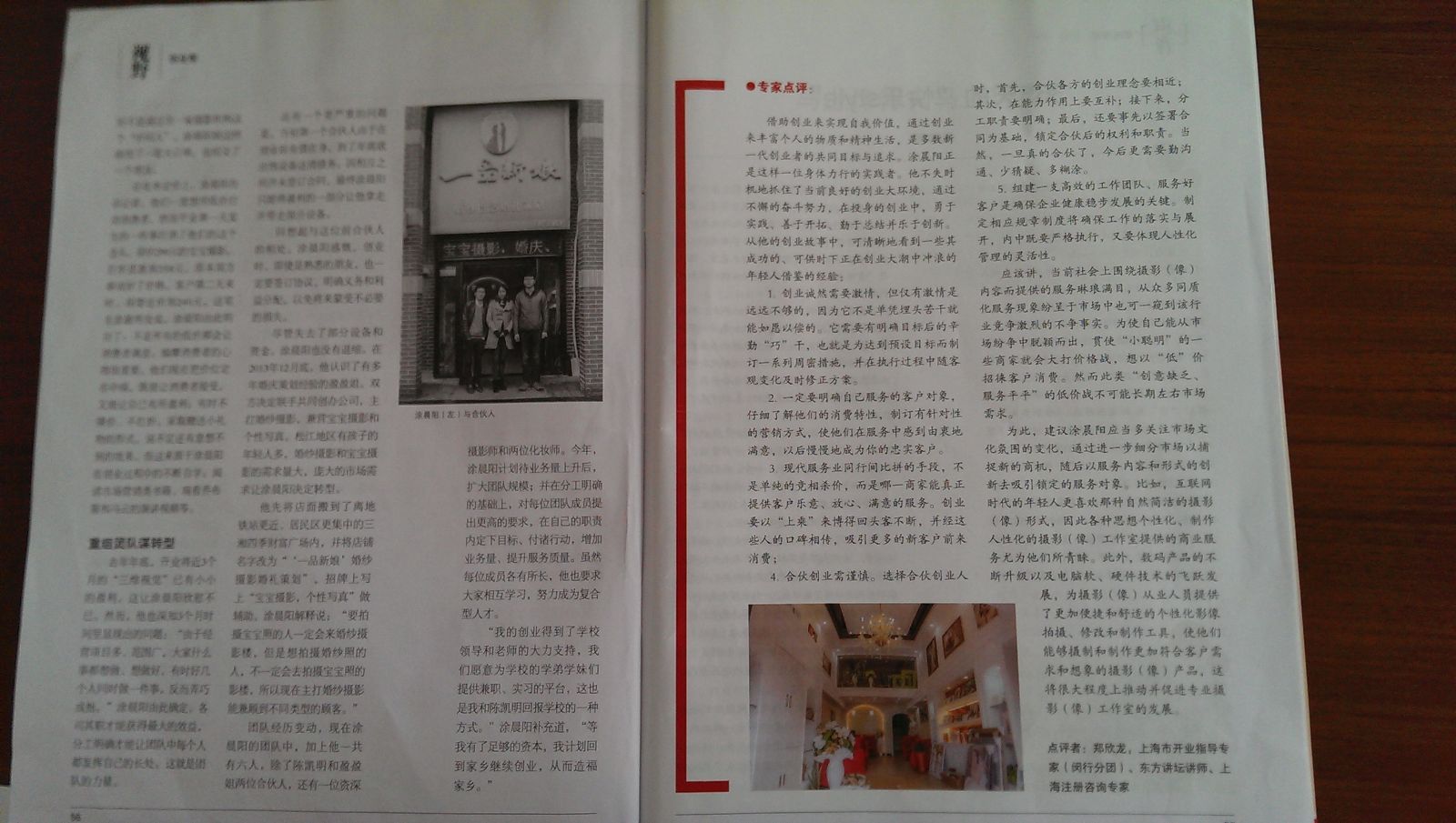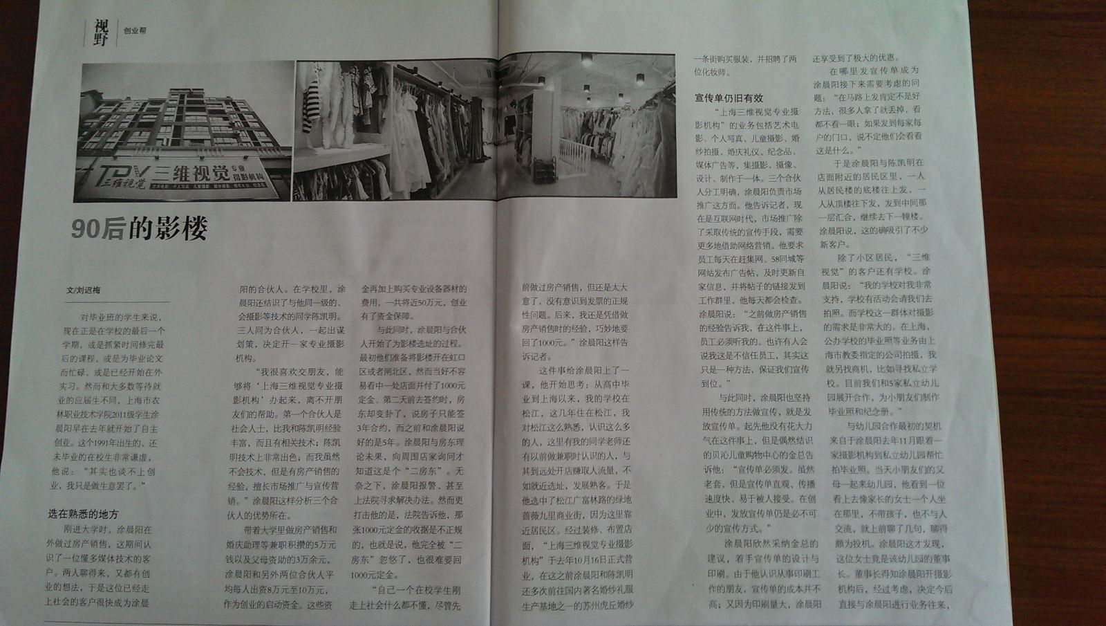 这件事给涂晨阳上了一课,他开始思考:从高中毕业到上海以来,我的学校在松江,这几年住在松江,我对松江这么熟悉,认识这么多的人,这里有我的同学老师还有以前做兼职时认识的人,与其到远处开店赚取人流量,不如就近选址,发展熟客。于是他选中了松江广富林路的绿地蔷薇九里商业街,因为这里靠近居民区。经过装修、布置店面,“上海三维视觉专业摄影机构”于去年10月16日正式营业,在这之前涂晨阳和陈凯明还多次前往国内著名婚纱礼服生产基地之一的苏州虎丘婚纱一条街购买服装,并招聘了两位化妆师。