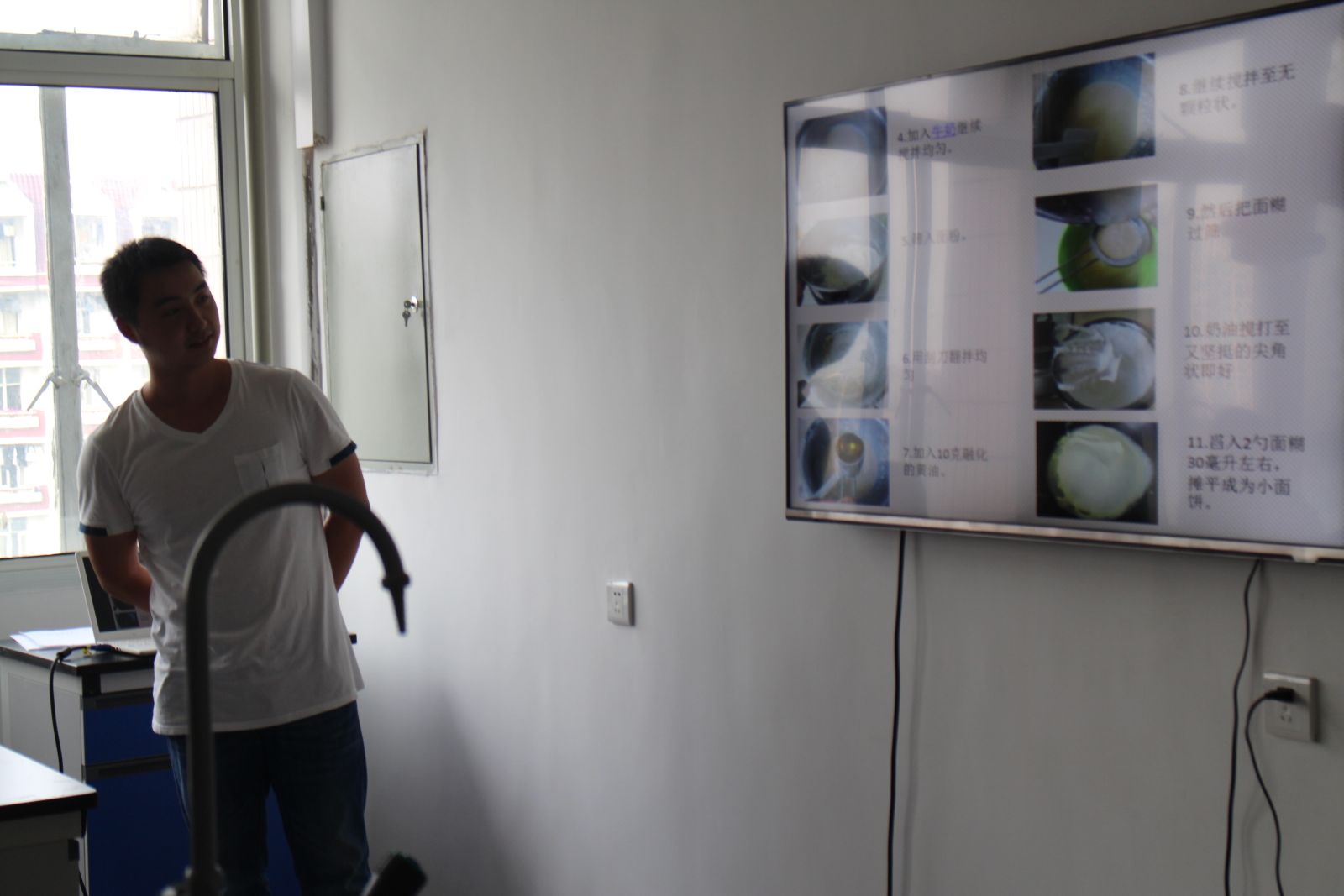 由于是首次活动,社长沈志贤先对社员进行了厨具使用规范、实验室及食品安全的培训,并向新社员们介绍了社团宗旨和特色。随后,社长自制的一段视频——水果班戟制作攻略和现场亲自动手示范使社员们了解学习了班戟的制作方法。在社长的指导下,社员们分组制作班戟。虽然多数同学第一次掌勺还很不熟练,做得很难看甚至失败了,但这丝毫抵挡不了他们再试一次的热情,1个小时后不少同学完成了作品并受到社长好评。 一位同学说道:“很喜欢食全食美社,可以给自己一个平台动手做美食。非常期待后续的活动。”系部几位老师也品尝到了同学们制作的港式甜点并表示赞可。