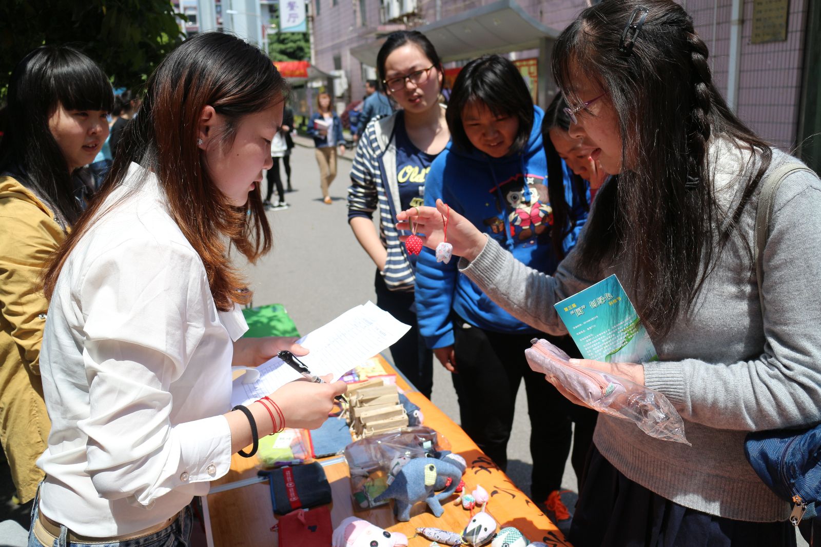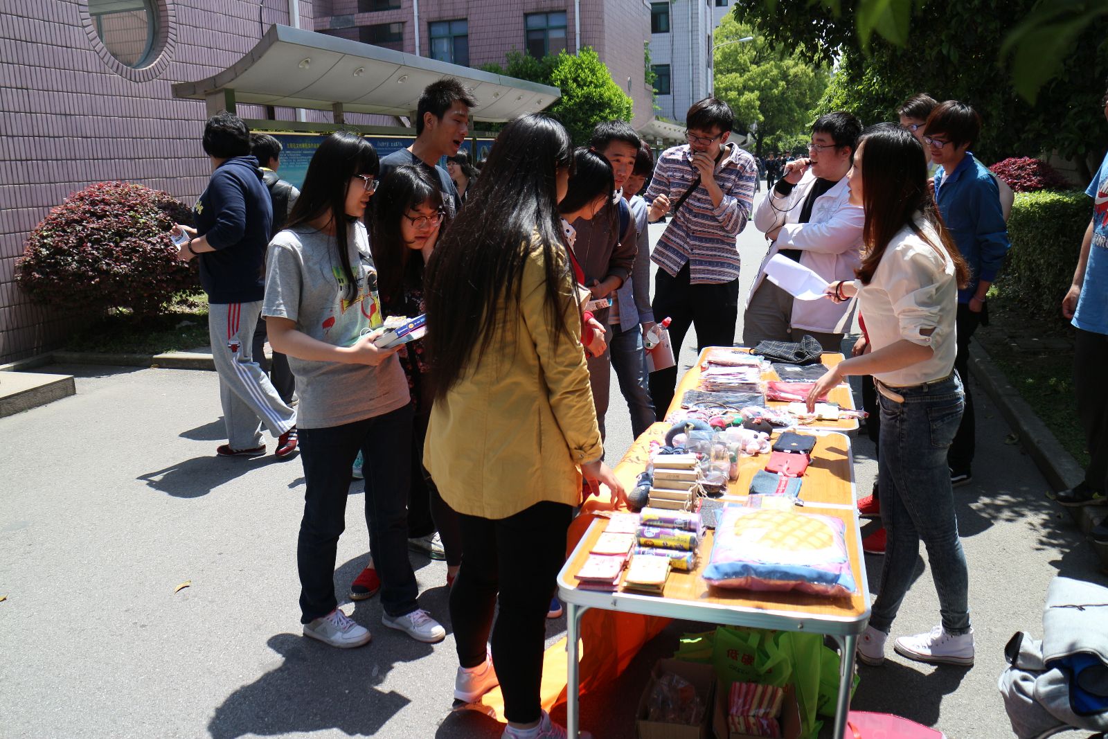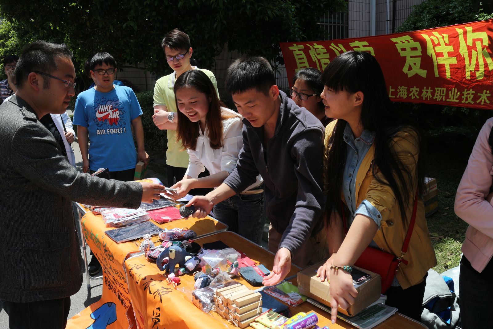 活动伊始,精美的手工工艺品就吸引了大量同学停下脚步前来问询。在志愿者向大家说明了本次活动的目的是慈善义卖,为了帮助需要帮助的人后,许多同学都纷纷慷慨解囊,购买了自己喜欢的物品;一些老师也驻足观看,也献出了自己的一份爱心。更有同学在付钱时说“剩下的是我的一份爱心,帮我捐了它吧!”,场面温馨而又感人。本次活动所得的善款会全部转交给松江“爱心衣救”志愿者协会,由他们统一捐助慈善事业。