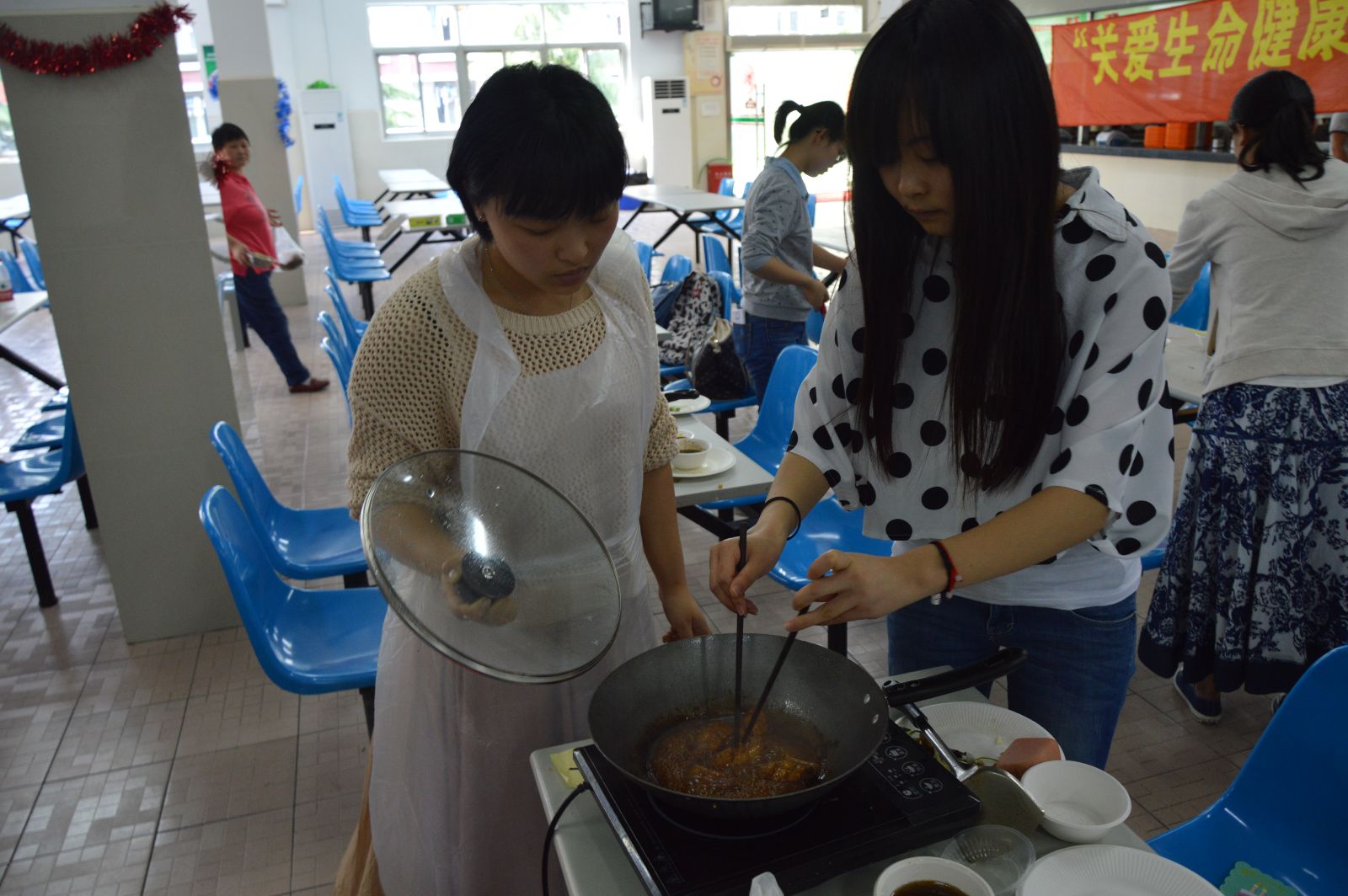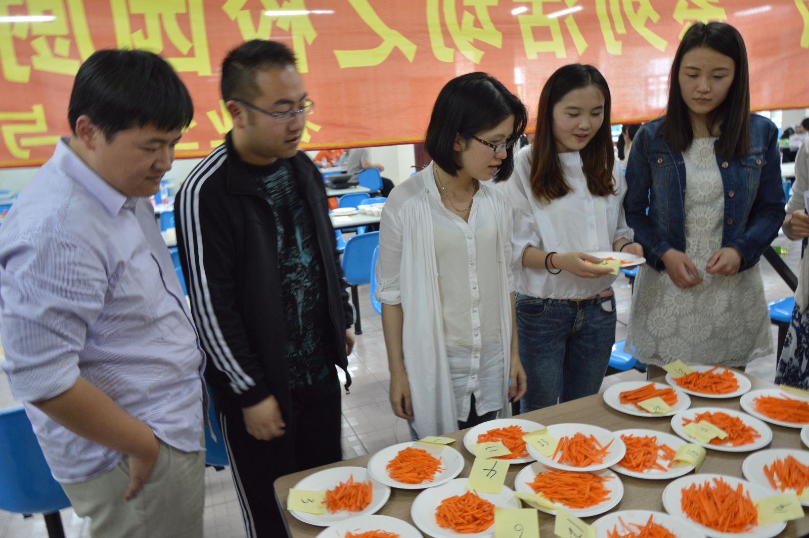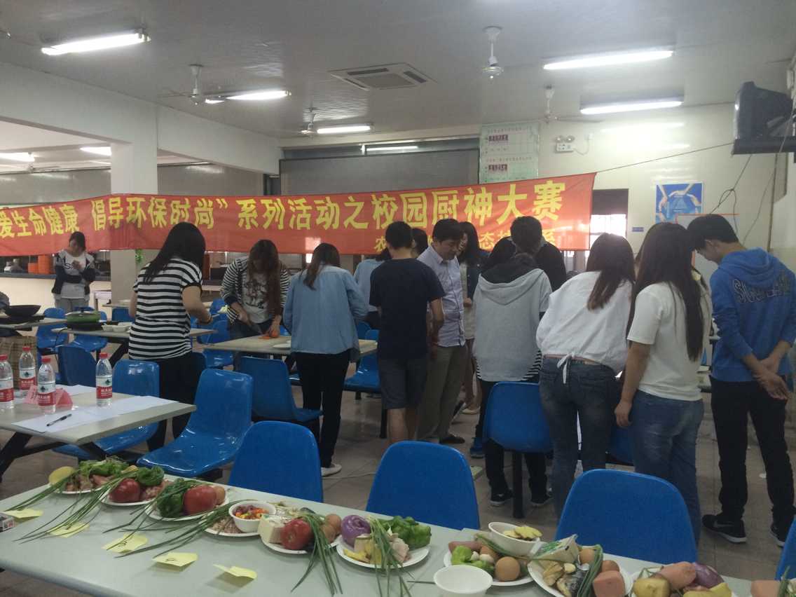 2015年5月13日下午1时许,由我系主办的“关爱生命健康,倡导环保时尚——校园厨神大赛(初赛)”在学校第二食堂拉开赛幕。本次活动邀请了团委书记许昊老师,团委副书记胡慧春老师、农生系党支部书记蒋洁老师,苌建菊老师和程媛老师和院学联主席顾嘉鑫、农生系学联主席刘珂,共七位作为活动评委,同时也邀请了第二食堂两位主厨作为特邀嘉宾在现场指导同学。
