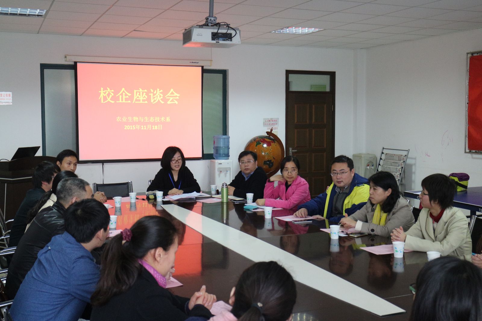 农生系主任张江向与会企业代表介绍了我院农生系的基本情况和相关专业概况,希望通过座谈会,加深与企业之间的相互了解,围绕学生培养是否符合企业发展进行交流,听取企业意见和建议,使校企双方在人才需求、培养方案、就业等方面加强合作,实现学校和企业的无缝对接,取得双赢。
