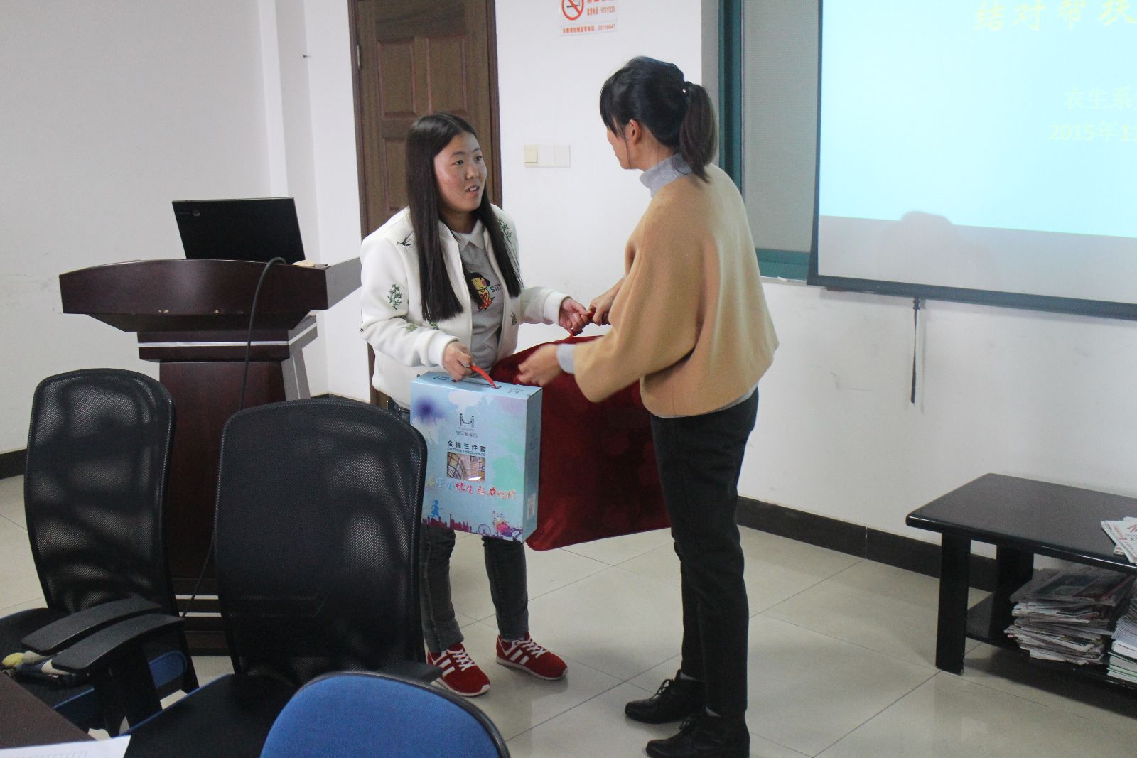 随后同学们结合自己的学习、生活与在座老师进行了介绍与交流。他们对学院能够以这样的形式对他们进行帮助表示赞同和感谢,感受到了学院的关怀,也将能得到更好的指导。生物142班温铖表示他会更加努力,靠自己走出相对落后的家乡,创造属于自己的天地。党员教师对同学们谈到的问题给予了积极回应并向结对同学赠送了学院和系部的慰问品。最后,蒋洁号召党员教师多走学生寝室深入了解同学,关心同学并以一句话鼓励在座同学:不比父母比自我,不比物质比精神,不比现在比将来。