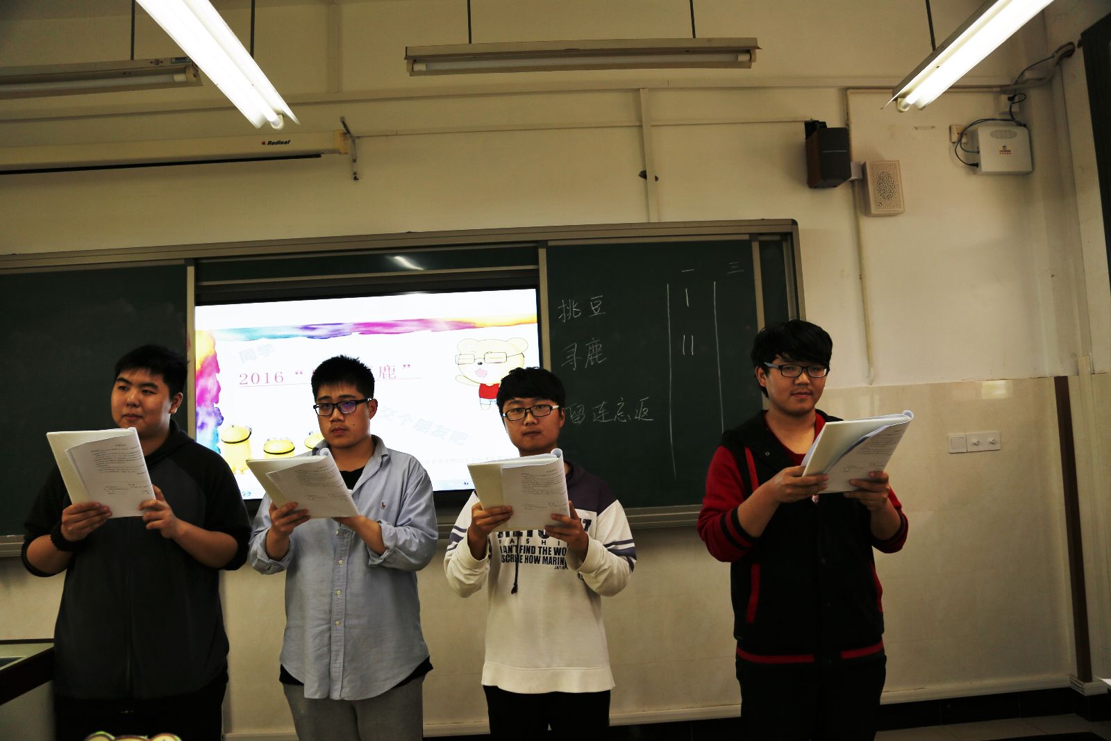 本次活动由三个轻松有趣的小游戏组成:“七嘴八舌”、为你转“声”、“快到碗里来”。第一轮游戏中,由四名工作人员同时说出四字成语的一个字,三分钟猜对成语数量多者获胜。本轮主要考验选手在复杂环境中提取信息的能力,同时也是对选手的成语掌握量的检验;第二轮为你转“声”,为工作站事先提供的视频片段配音,由评委和大众评委综合评判,分高者获胜。各队使出浑身解数,或现场演绎还原片段,或改编原有情节,选手精彩的表现获得观众阵阵掌声;“快到碗里来”,队员依次用吸管传递乒乓球,三分钟内传递最多者胜出。本轮环节可谓状况百出,有的队员中途掉落、甚至有的根本吸不起来,但他们都没有放弃,个人信念及队友的鼓励让他们战到最后一刻。最后“寻鹿队”凭借非凡的团队协作及临场发挥获得本次活动冠军。