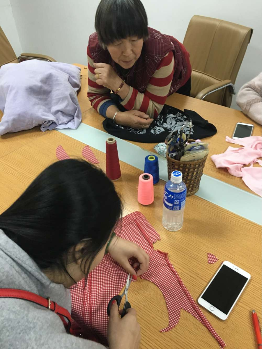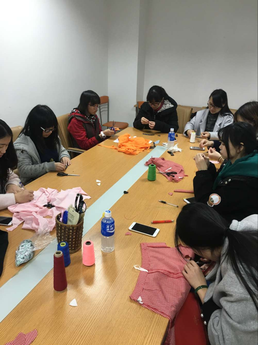 活动现场同学们利用收集到的废旧衣物在专业老师的指导下制作各式各样的布艺。活动中,成员们十分认真的用旧衣物制作了零钱包,玩具,布艺装饰等物品。在作品完成后,成员们纷纷发出感慨,原来废弃的东西在自己的手中也可以变出“花”来。