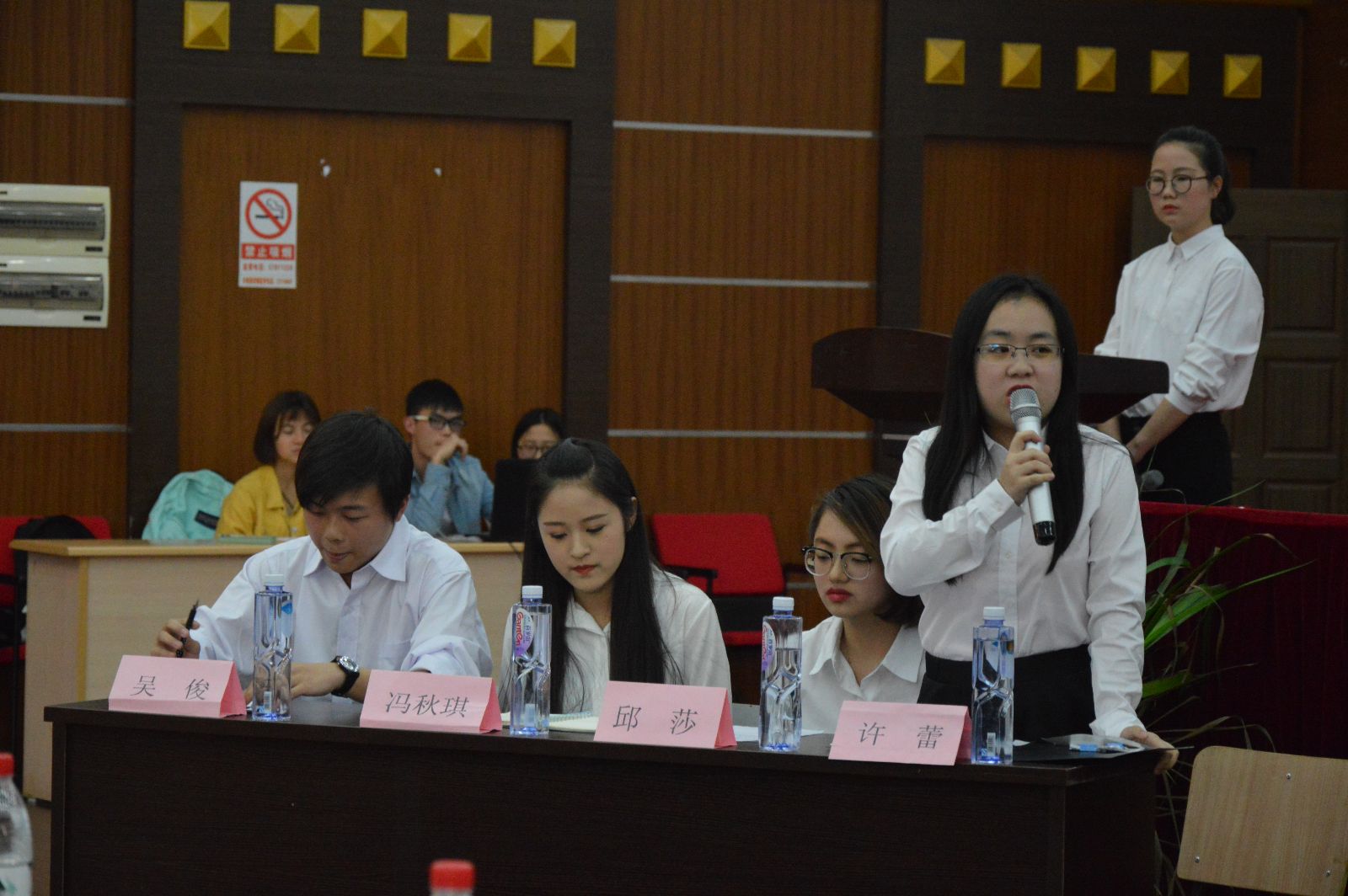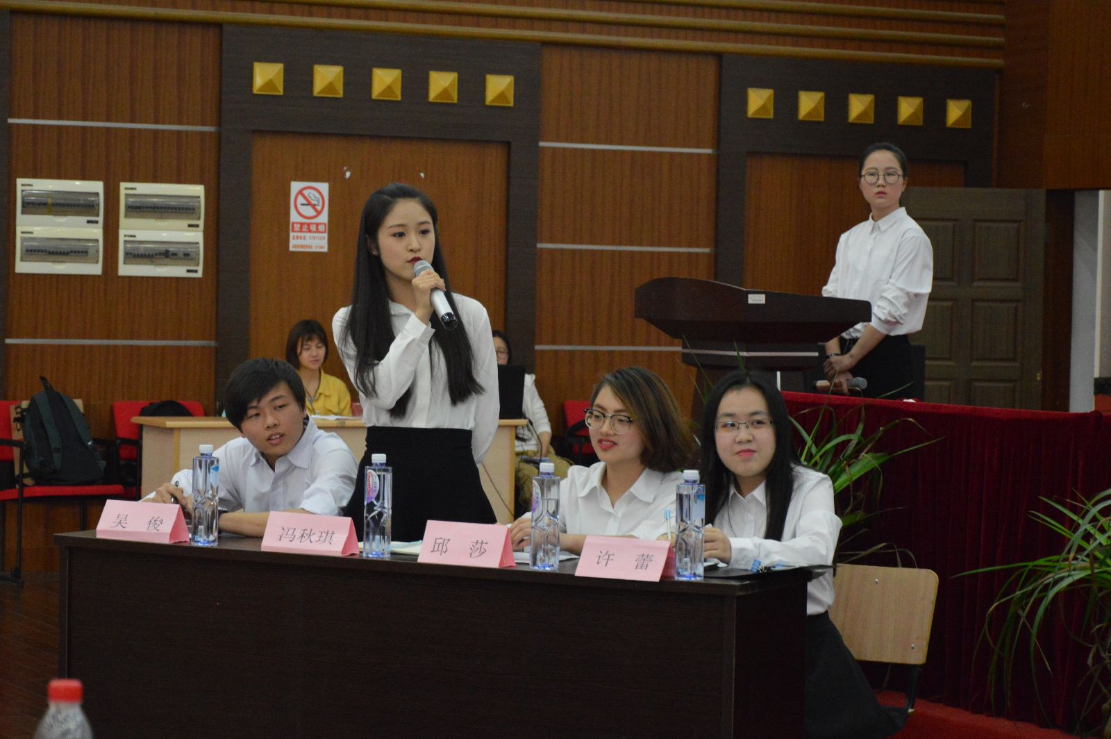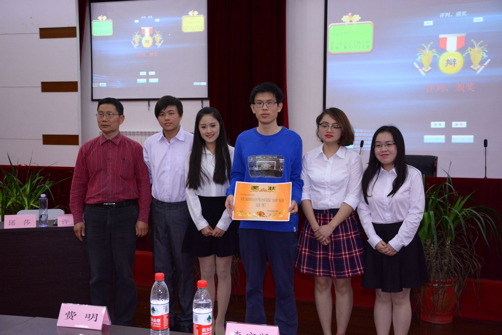 本次辩论赛的辩题为学习社会主义核心价值观,教育引导更重要还是自我认知更重要。正方是来自农生系的四位辩手:许蕾、邱莎、冯秋琪、吴俊同学,他们的观点是学习社会主义核心价值观,教育引导更重要;反方是来自农信系的四位辩手。比赛分为三个环节。当主持人开始计时时,双方开始进入竞争氛围。第一环节开始时,是双方提问时间,一开始,农生系代表的正方略处于劣势,面对反方条条事理的反驳,席下的观众们都为此吸了一口气。第二环节则为坚持立场,自由辩论,通过举例论证得出“学习社会主义核心价值观,教育引导更为重要”的观点。这一过程中双方唇枪舌剑,不相上下,你来我往。面对反方的侃侃而谈,我方更显得沉着冷静,故我方在此环节中更胜一筹。最后双方总结,由评委代表李宗贤点评,他在点评时提到一句话让众人受益匪浅——辩论赛考验的是辩论双方的辩词是有逻辑,而不是一味的把所有的东西都扯到自己想要辩论的观点上去。辩论赛要的是精彩,而不是喧哗。最后,辩论赛我方获胜,全体成员握手拍照留念。