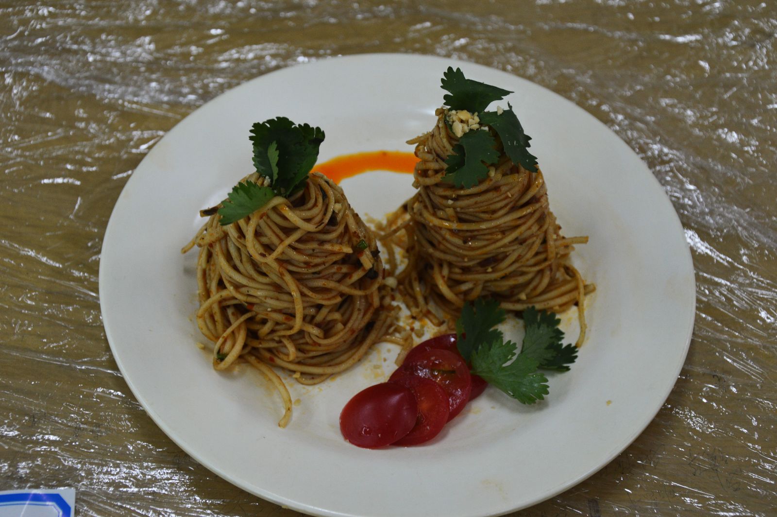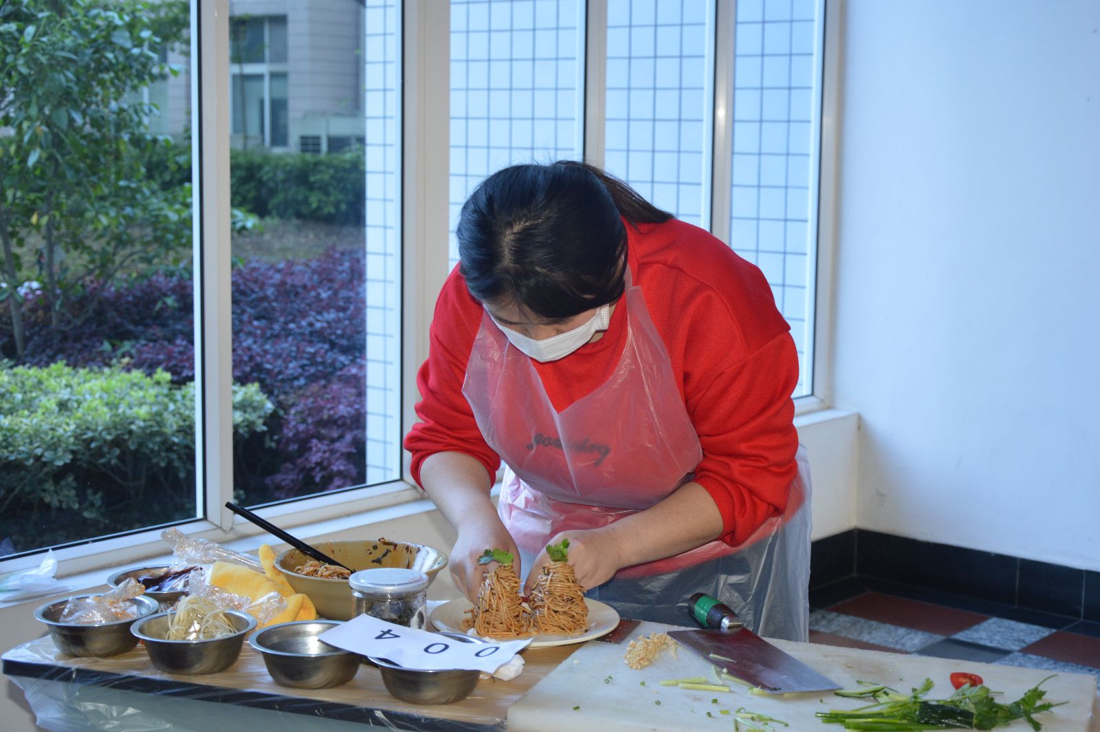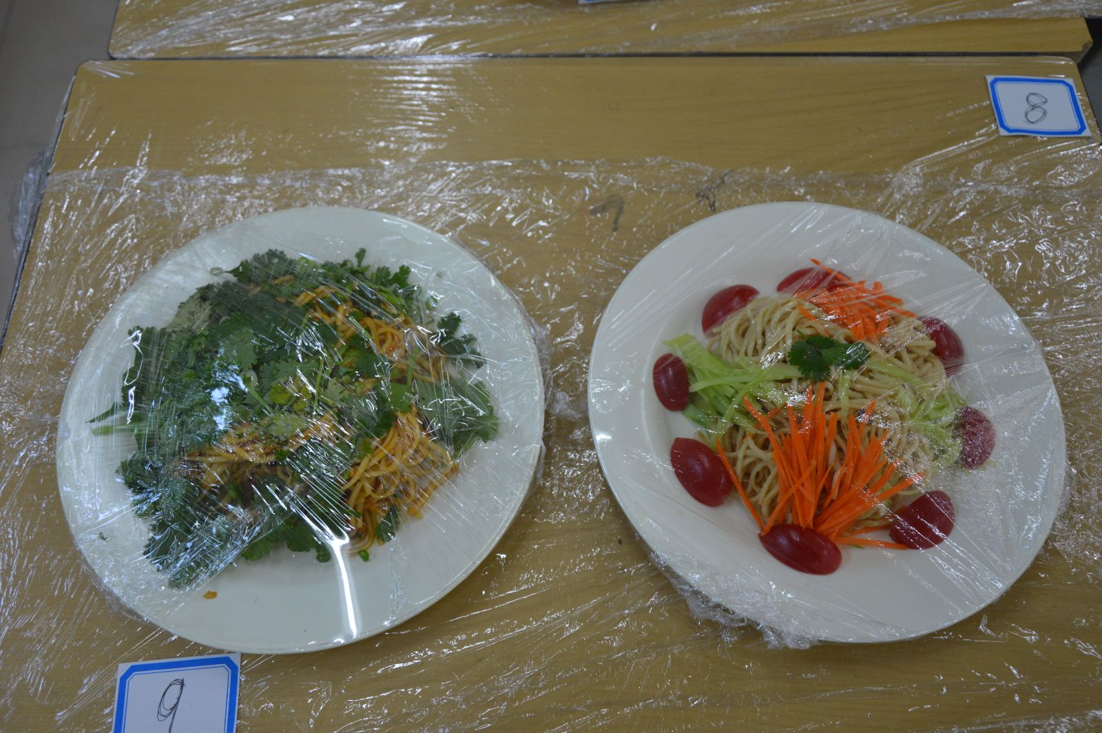 本次大赛比赛项目是冷面制作,活动分为两个会场,主会场用于选手制作参赛作品,分会场用于成品展示以及评审投票点评。参赛人员分为两组,第一组有五位选手,比赛一开始就全身心投入紧张的气氛当中,将炉火纯青的刀功、操作手法展现的淋漓尽致。继紧张而又激烈的制作过程之后,选手们又将成品摆置成不同的形态,各有千秋,寓意深涵,如蓝茜同学的摆盘含有“双喜临门”之意的川味冷面。第二组选手感受过之前的紧张气氛之后,显然放松了许多,神态怡然,手上功夫也十分了得。在经过投票环节之后,最终1号选手肖翔、4号选手蓝茜、9号选手曹家华进入最终的总决赛。总决赛定于5月24日13:30于食堂二楼举行,主题为家乡的菜,选手可携一名助手一起参赛。到时欢迎全院师生参加指导。