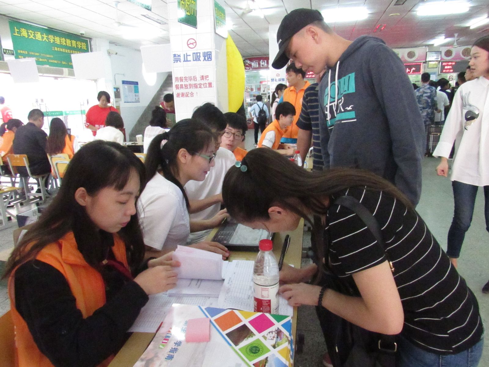 2017年9月16日上午八时,农生系在学生第一食堂内的迎新工作已经准备就绪,现场有农生系党总支书记蒋洁老师、团总支书记高晓翠老师、辅导员范小雪老师、苌建菊老师和程媛老师以及三十多名志愿者协同完成迎新工作。
