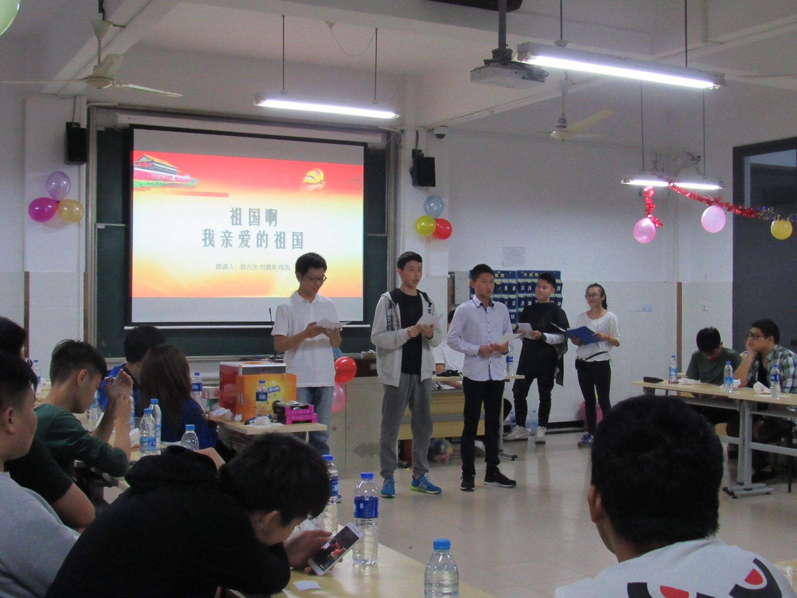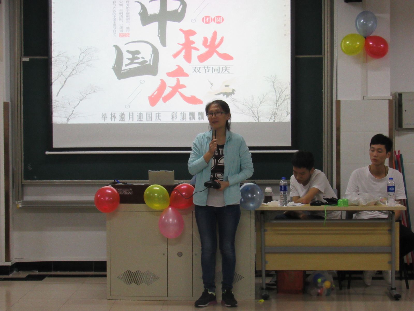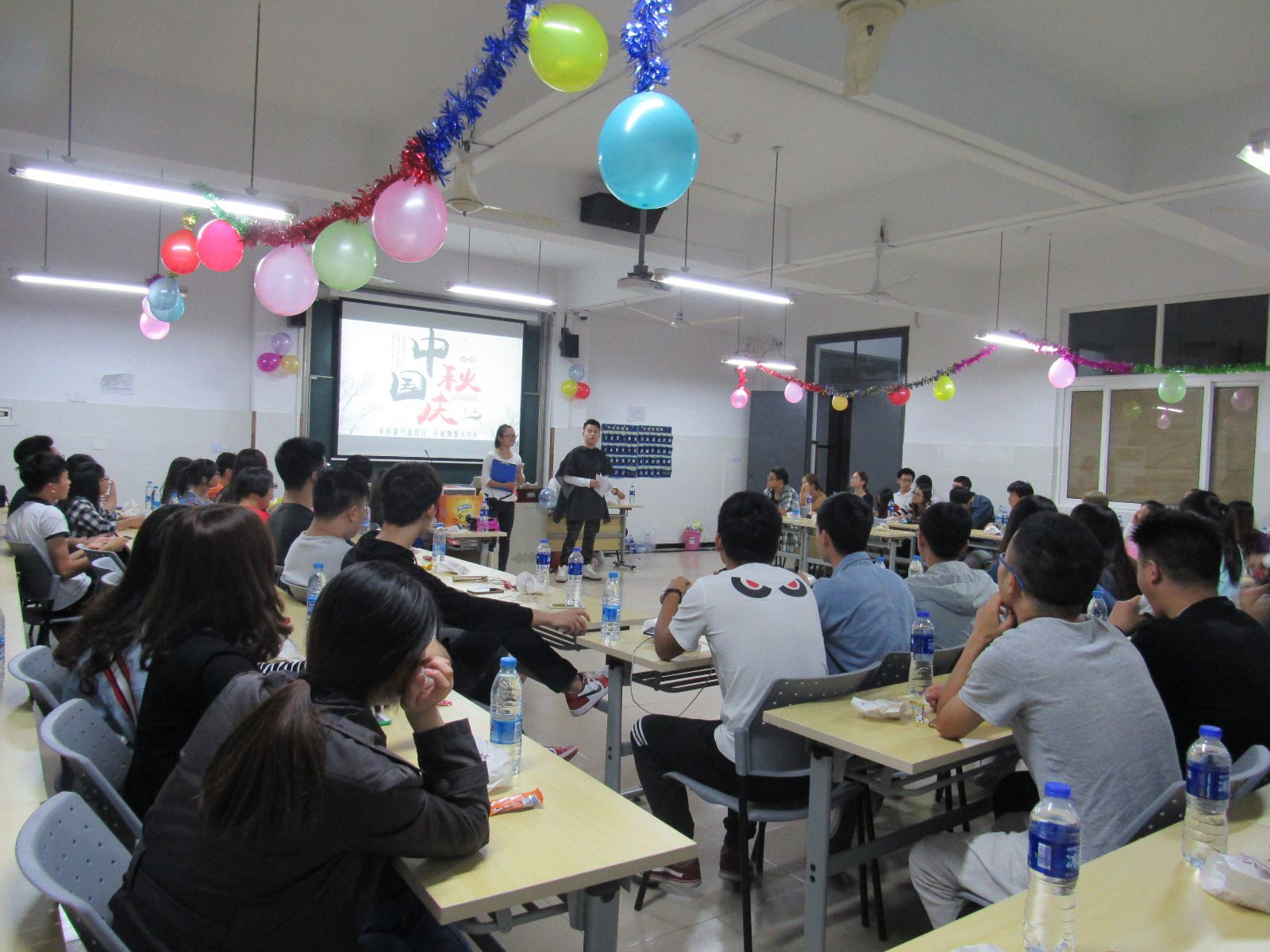 活动中,大一新生徐思雨和周钰龙的歌曲《城里的月光》,伴随着手机灯光,大家随音乐一起摇摆;60年的历史铸就了60年的辉煌,紧接着殷方东、刘嘉燊和周凯同学带来的《国庆诗歌朗诵》完美的诠释了中国的辉煌历史,点燃了同学们心中的熊熊烈火;游戏环节再次让现场气氛达到白热化,游戏有晾衣杆夹月饼、心有灵犀,演技穿话筒,踩气球等,游戏虽然普通,但同学们秉持着“友谊第一,比赛第二”的运动精神,彼此之间合作亲密无间;抽奖环节每位同学也都积极踊跃的参与其中,获奖者收获满满。
