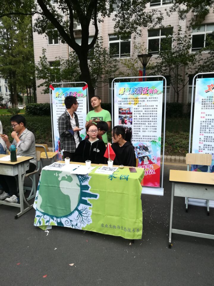 2017年10月19日下午十五时三十分,农生系所属的五个社团在一教门口进行新学期的招新工作。各个社团负责人以及部分团学干部在现场维持秩序。