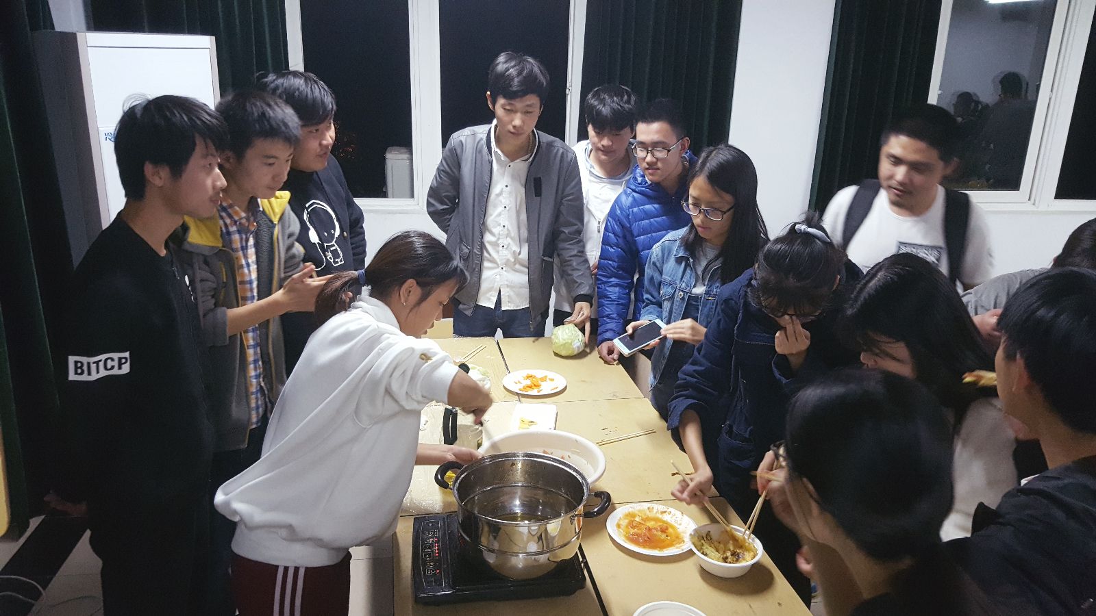 下午4点10分主持人进行开场白并宣布活动开始,三组参赛人员介绍了本组的名字以及口号,鼓舞士气后每组厨师长带领成员进行食材选取,主持人开始计时后每组开始了紧张而又激烈的“奋斗”中。随着时间的流逝,第二组率先完成了菜品“炸薯条”,大家也都逐一进行了品尝。紧接着其他两组也完成了部分菜品,大家也进行了品尝,菜品有芝士土豆泥,火腿土豆饼,“红绿灯”等,让大家尽享美食之乐。这一活动通过利用土豆食材制作不同的食物来让那些远离家乡的同学们感受到像在家一样的温暖,尝到家的味道,并且借此机会让同学们互相认识,增进同学之间的友谊,丰富同学们的课余生活,也会增强同学们对健康饮食的研究与开发兴趣,锻炼大家的动手动脑能力,为喜爱厨艺和热爱美食的同学提供了一个展现自我的舞台。