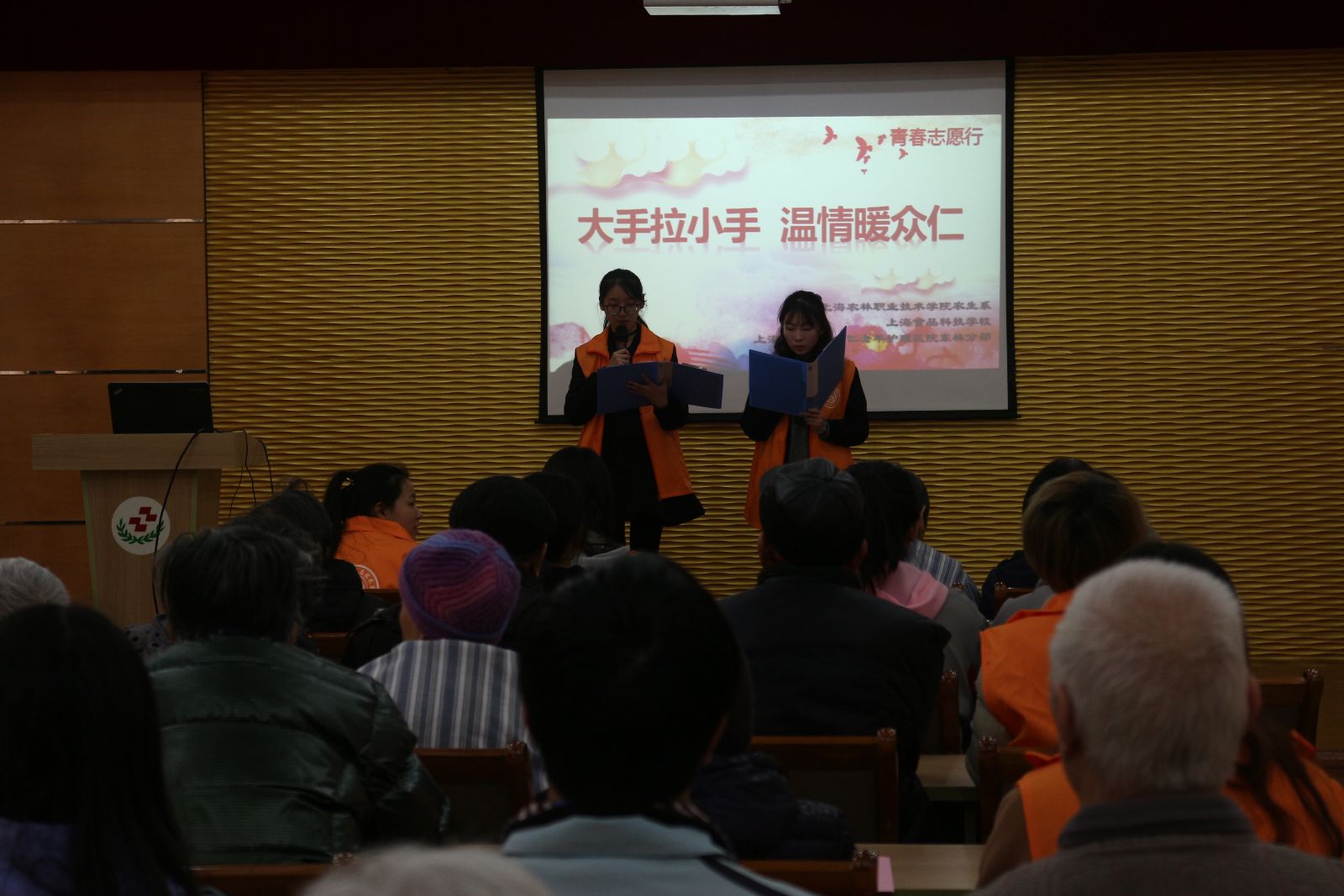 下午一点半,我系团总支书记高晓翠带领志愿者们从上海农林职业技术学院车发,经历大约一个小时的车程,终于来到了众仁护理院。一走进会议室,老人们已经早早地在院子里坐好,欢迎我们的志愿者。我们的志愿者不但提前排练了文艺节目,还准备了康乃馨和玫瑰献给老人们。护理院里顿时萦绕着欢声笑语。在整个志愿活动开展期间,志愿者们还为老人揉揉肩、捶捶背、按摩等,一些志愿者还围在老人身边陪他们聊天,老人们都高兴地合不拢嘴,在志愿者们的体贴入微的关怀下,整个护理院的老人们感受着亲人般的温暖。