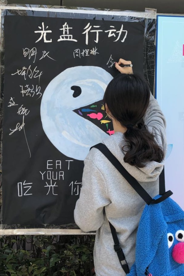 中午11点,周橙琳部长带领部员在食堂门口摆放了桌子与签名分发的矿泉水与饮料。部员们一边向过路的同学们做“光盘行动”的宣传一边让同学们在海报上签下自己的名字让他们响应光盘的号召,并且邀请他们进行拍照合影,最后送出矿泉水或饮料。同学们对于“光盘”行动的重要性并没有明确的认知,但是在部员的宣传与讲解过后,许多同学纷纷自觉地来到海报前进行签名,为“光盘”行动出了一份自己的力量,也接力成为了“光盘”一族。