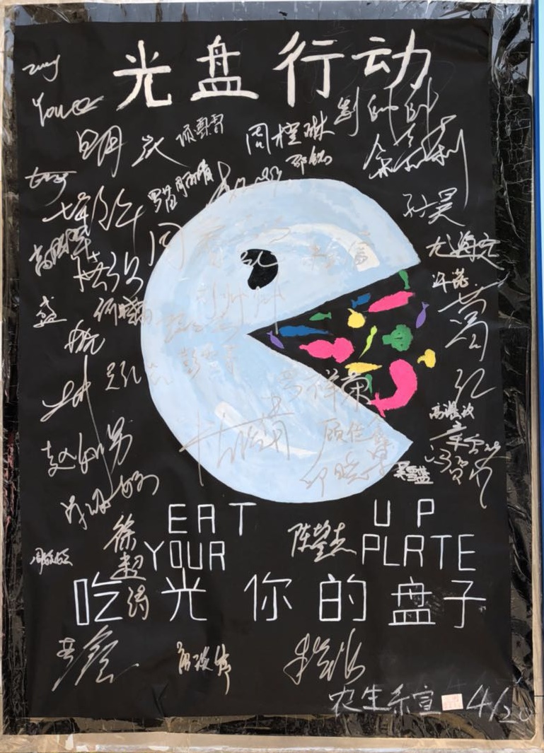 2018年4月18日,农生系权益部为大力提倡文明用餐的良好风气,培养健康文明的餐饮习惯,营造良好的校园文化,我系权益部部长带领部员们在一食堂门口开展了光盘行动。