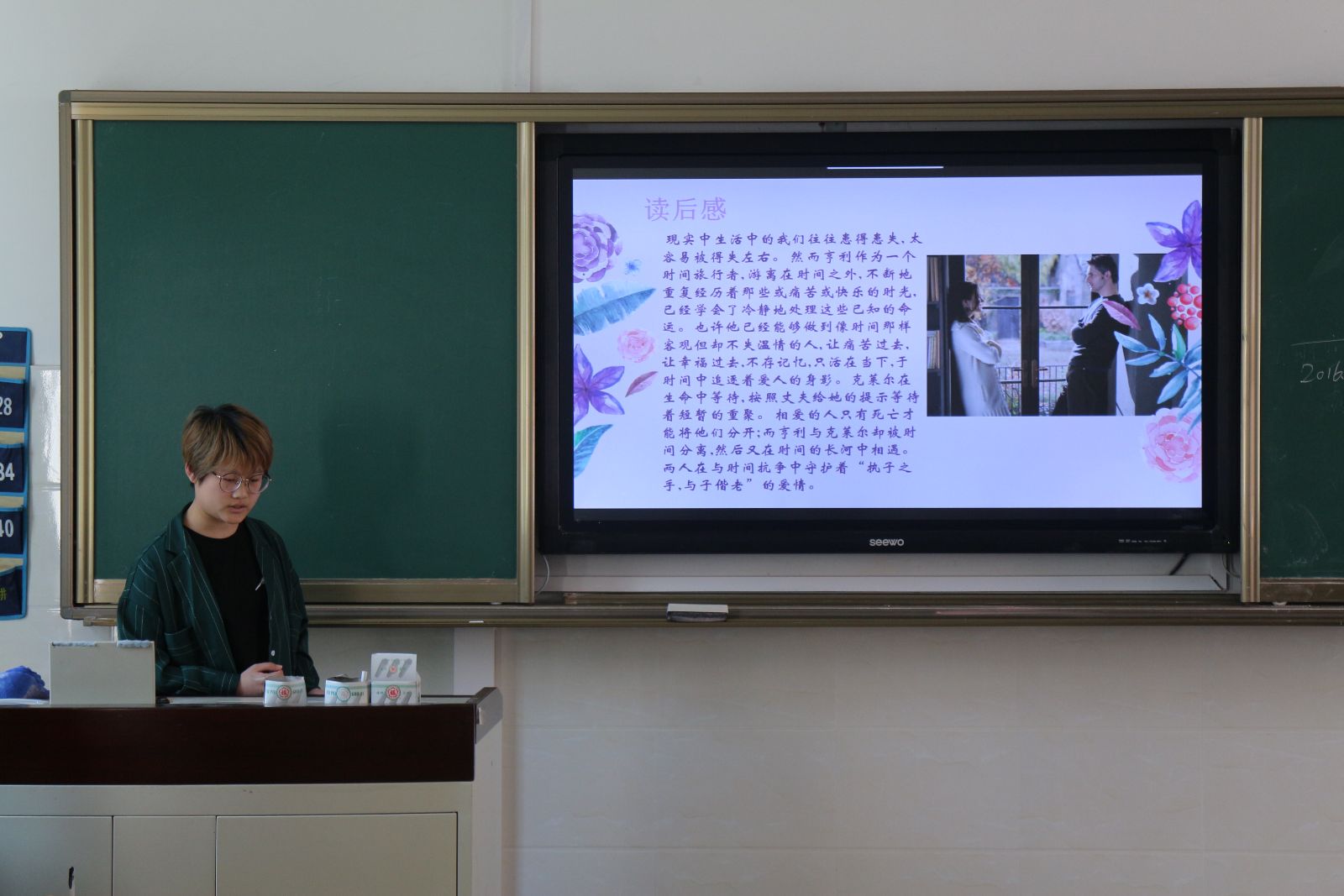 在4月16日同学们将自己阅读文学作品后的心得体会撰写成文,制作成PPT,其包含了书籍的介绍,作者简介,感触最深的章节片段,最经典的名言警句,最激励人生的思想观念、联系社会背景等内容,在班级内进行演讲。活动进行时同学们都做了充分的准备,大家踊跃发言,畅谈读书感悟,分享美文佳作,气氛热烈,精彩说辞和优秀书目频出,掌声不断活动进行了短暂的一周,学生享受到了一次精神的盛宴,深刻感受到阅读带给人们的思想碰撞、心灵交汇和精神洗礼。