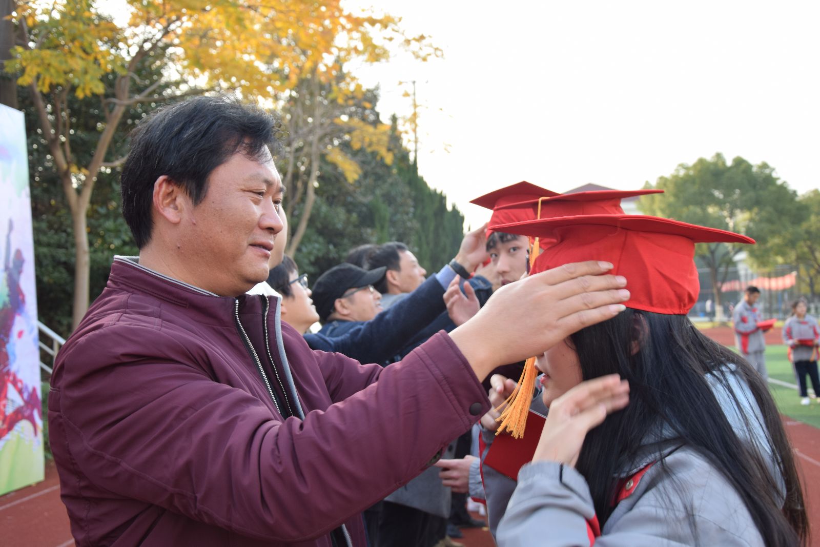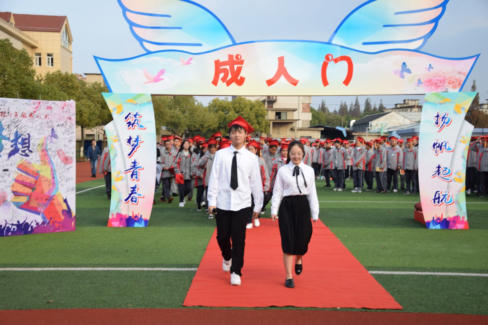 第二项议程“明责任,立担当”,老师们给同学们佩戴成人帽,颁发《中华人民共和国宪法》,并带领同学们进行了宣誓。接着是农生系生物172班的职康鼎同学代表给同学们发言寄语,家长代表寄语,学校党总支副书记寄语,给18岁成年的食品科技学校的同学们美好祝福。下一个议程是学生们行感恩节礼,最后随着团歌的旋律,惨礼学生迈过成人门,结束了他们的18岁成人礼。