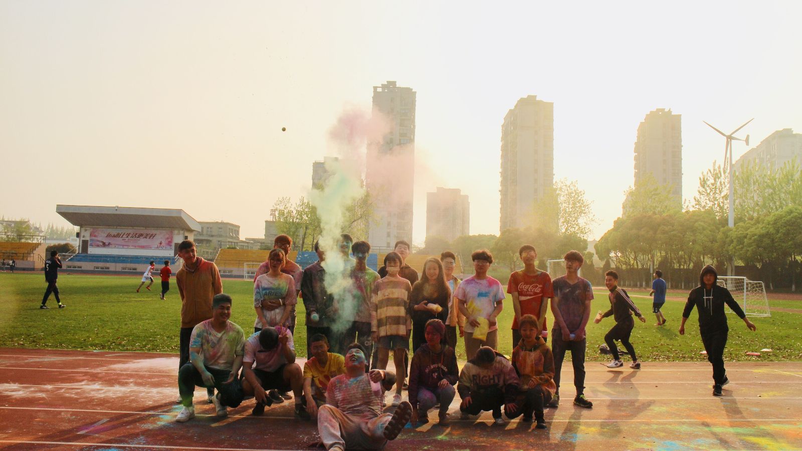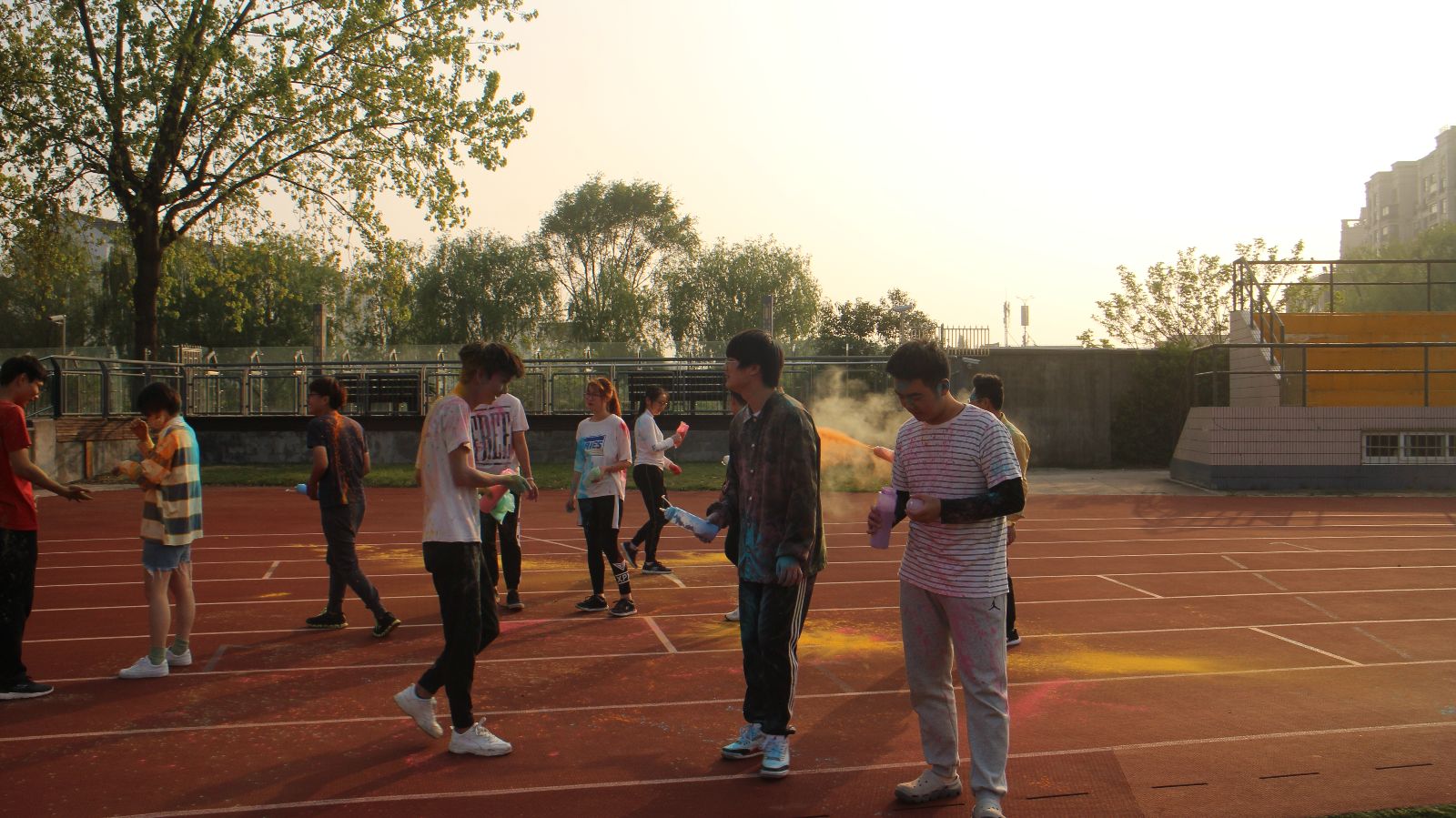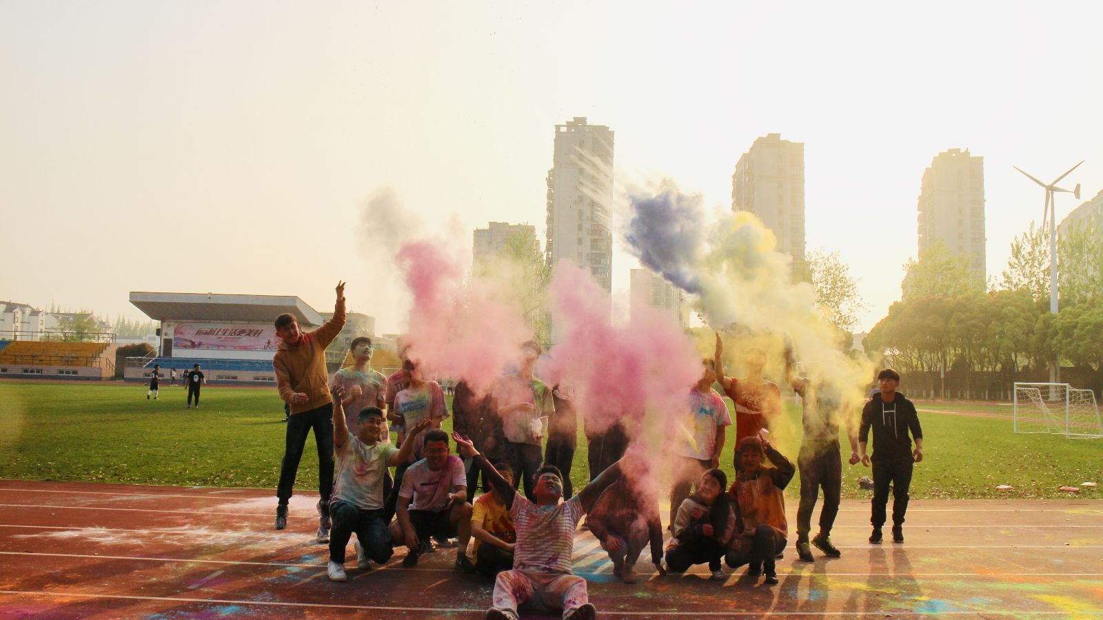 在活动正式开始前由质检172班吴仁杰同学带领着参跑者们做热身运动,随后,在彩虹跑开跑的口令声中,20余名同学有序从起点出发,彩虹跑激情之旅正式开启。五彩的粉末飞扬,同学们彻底沸腾,参跑者从头到脚瞬间变成五颜六色,将跑道渲染成一条绚丽的彩虹。他们不断的将手中的七彩粉末跑向空中,红、黄、蓝各色粉末在半空交汇,形成了一团团美丽的“彩霞”,景色如梦如境。此时,没有竞技赛的紧迫感,只有健康、快乐相伴。