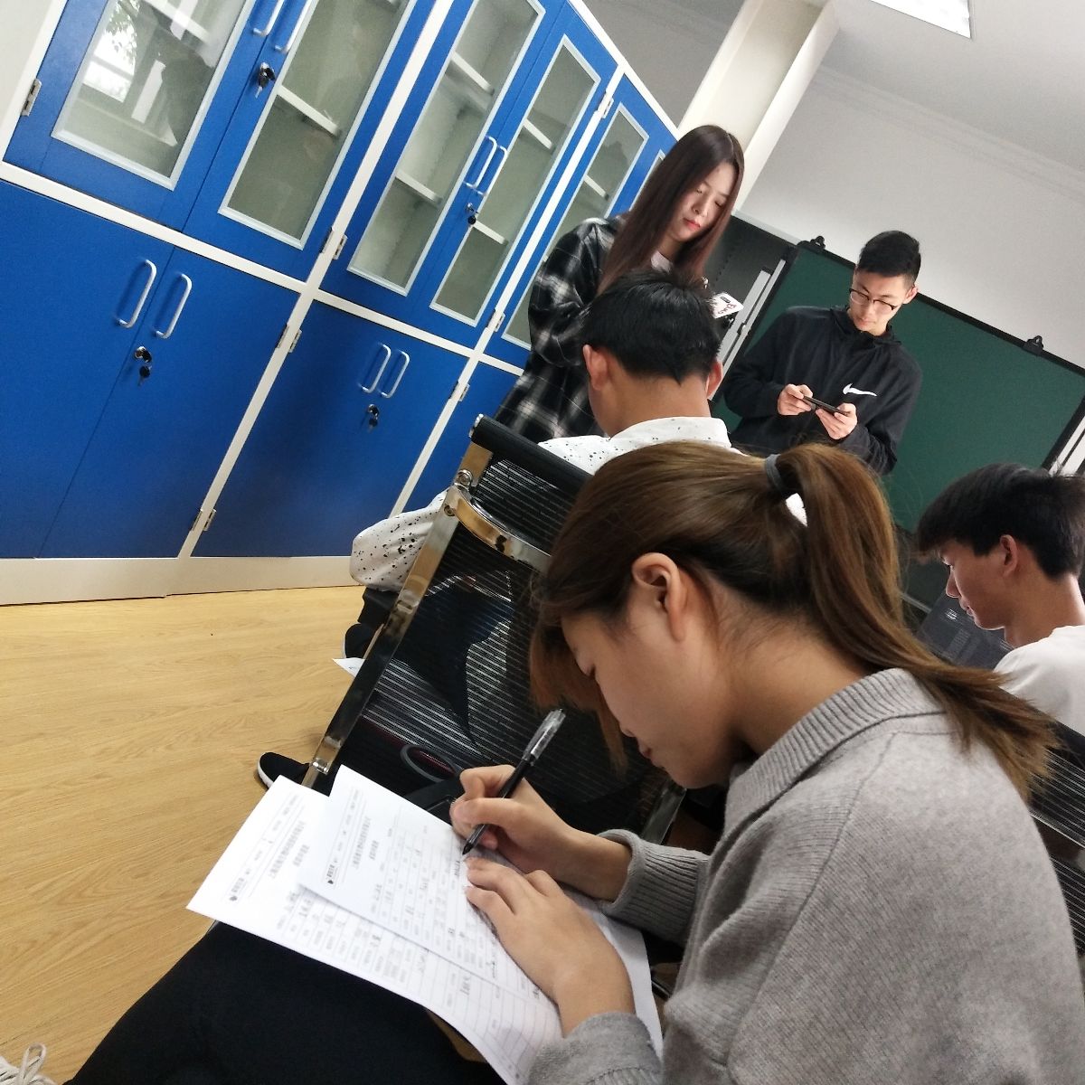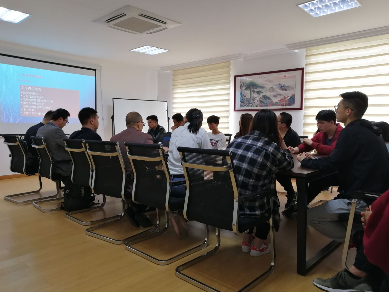 在松江区的公司里,共有33名同学,来到公司后大家分成两队,分别由公司领导以及人事部的主管分别面试。到达公司后,各位公司一线主管首先详细的介绍了公司的操作流程。经过一番介绍,大家在侯等室填写表格准备面试。大家以三人一组进行面试,积极讨论了可能会面对的问题。