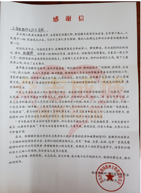 近日,农生系两名参与疫情防控志愿服务的学生收到来自服务单位的感谢信。