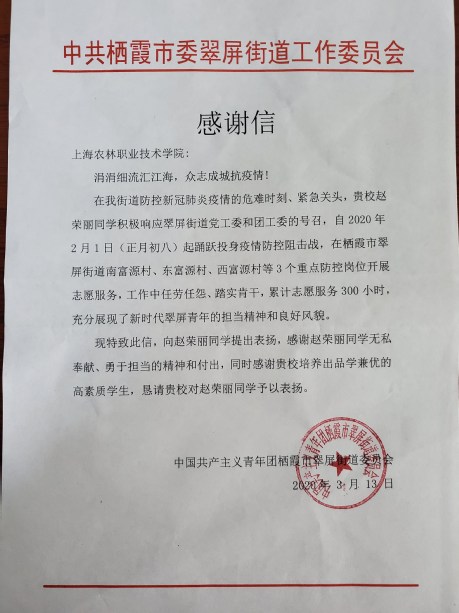 在我街道防控新冠肺炎疫情的危难时刻、紧急关头,贵校赵荣丽同学积极响应翠屏街道党工委和团工委的号召,自 2020 年 2 月 1 日(正月初八)起踊跃投身疫情防控阻击战,在栖霞市翠屏街道南富源村、东富源村、西富源村等 3 个重点防控岗位开展志愿服务,工作中任劳任怨、踏实肯干,累计志愿服务 300 小时,充分展现了新时代翠屏青年的担当精神和良好风貌。