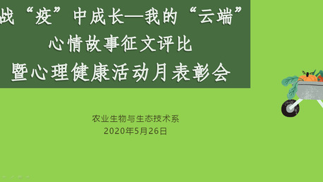 为提升学生心理品质,促进学生心理健康,表彰今年心理健康活动月中积极参与、表现优秀的同学,加强抗“疫”期间大学生的心理健康教育、生命教育及社会责任感教育,5月26日晚,农生系在腾讯会议平台举办了战“疫”中成长——我的“云端”心情故事征文评比暨心理健康活动月表彰会,党总支副书记蒋洁、心理咨询室老师张欣、系全体辅导员及一百余名学生参加。