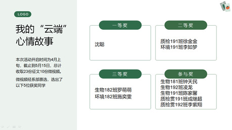 会上,23位参赛选手以战“疫”中成长为题,讲述自己或身边人的抗疫故事,讲述英雄和逆行者带给自己的感悟,讲述自己在这特殊时期与家人的互动成长,讲述因祖国的硬核抗疫而心生的骄傲和感动……展现了年轻一代在疫情面前的勇气、态度和责任担当,传递了心理正能量。最终生物191班潘燕秋、生物181班吴育衡、环境191班王义翎三人获得一等奖。会议还对此次心理健康活动月的其他系列活动进行了表彰。质检191班王懿昀获“致敬疫情前线最美逆行者”主题手抄报一等奖,环境191班李如梦等11人获心理电影观摩感悟优秀质量奖;生物172班沈聪获我的“云端”心情故事微视频一等奖。