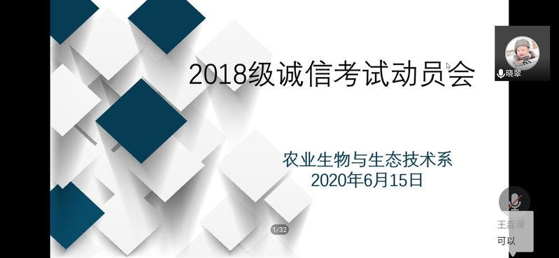 为加强学风建设,严肃考风考纪,6月15日,农生系在腾讯会议上召开了期末诚信考试动员会,该会由18级辅导员组织召开,全体18级学生参加了动员大会。