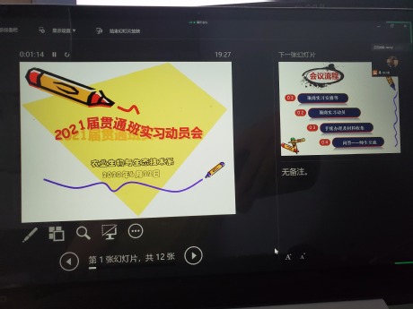 6月22日晚,农生系在腾讯会议平台召开2021届贯通班线上实习动员会,落实疫情防控期间学生实习实训工作,动员教育全体学生统一思想,提高认识,明确实习任务,扎实开展毕业实习。系部相关负责人、实习指导老师、辅导员、班主任及62名2021届贯通班学生参加会议。