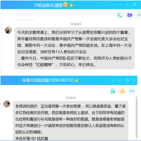 课后,与会成员发表感想,对党课内容和形式表示了肯定。环境191班王义羚说:“课程里,我穿越回一百多年前,体验那段峥嵘岁月。每一个阶段都有年轻的力量在屡败屡战中探索出路。时代需要这样的人挺身而出。我不禁发出感慨,吾辈当自强,在新时代的号召下,我们准备好了。”环境181班沈磊说:“这节微党课真的使我受益匪浅,我对中国的近代史有了进一步了解。如果没有共产党,我觉得中国不可能有今天的繁荣昌盛,正因为有中国共产党的带领和指导,现在的中国才会越来越强大。”生物191张佳说:“通过这次的党课学习,给我留下了深刻的印象,也更加坚定了我要入党,追求共产主义理想,为党的伟大事业奉献青春的决心和信念。”