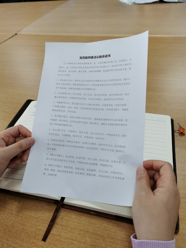 最后,全体教师签署《党员教师廉洁从教承诺书》。以此督促全体教师不断提高自身职业道德素养,进一步规范廉洁从教行为,以德修己,以德育人,进一步提高自身的思想政治素质和职业道德水平,适应新形势下教育发展的要求,依法执教,廉洁从教,争做师德楷模,塑造教师队伍的良好形象。