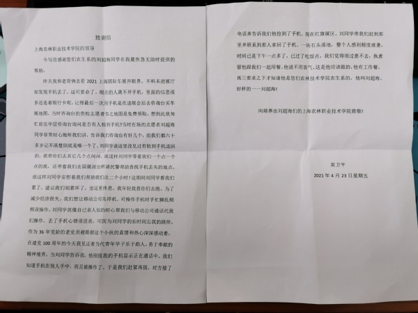 第十九届上海国际车展在国家会展中心举行,农生系响应学院团委号召选派13名优秀学生作为本次车展志愿者。其中生物191班刘超海同学负责咨询台志愿服务,在此过程中尽心尽责的帮助前来参观的群众找回丢失的手机。刘超海同学做了好事不留名的行为深深感动了这名群众,在多方打听下得知这名志愿者是农生系19级的学生,在次日寄来感谢信。