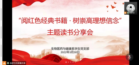 为加强思想政治引领,引导广大青年学生学史明理、学史增信、学史崇德、学史力行, 3月30日晚,生药系学生党支部举办“线上读书交流”主题党日。支部党员、入党积极分子等30余人参加。