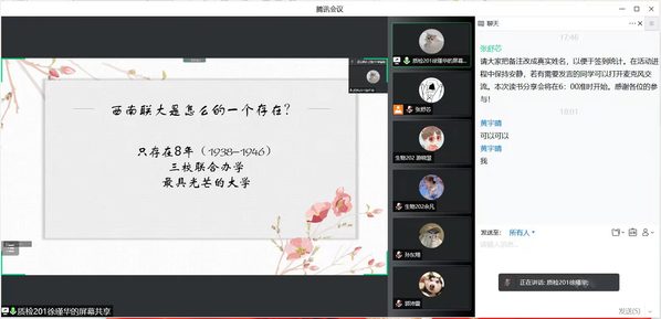 会前,大家根据自己的兴趣选择喜欢的好书,在认真阅读的基础上递交了读后感。会中,质检201班徐瑾华带领同学们从西南联大的历史、书籍内容分享、个人心得体会三方面领略《西南联大国史课》这本书。该书以时间为轴,由远及近,收录张荫麟、陈寅恪、吴晗、雷海宗四位教授的代表著作,从多个维度探寻中国历史的发展,全面展现各位先生博采众长的学术成果,以及西南联大兼容并包的学术氛围。徐瑾华带领大家从这本书中看到了山河破碎、民族危亡之际大师们的刚毅坚卓、学无止境和勇于担当,更体会了文明传承和文化教育对一个民族的重要性,极大的增强了同学们的民族自豪感和文化自信心。