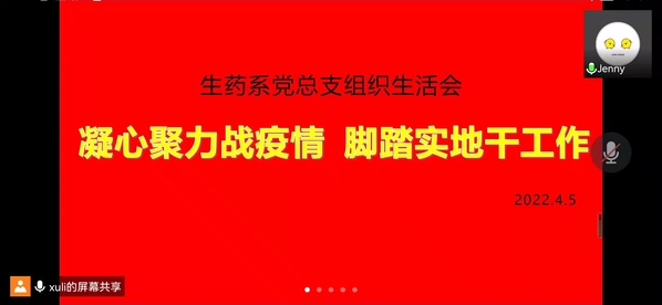 为了充分发挥基层党组织的战斗堡垒和先锋模范作用,根据学院党委工作要求,4月5日,生药系党总支开展“凝心聚力战疫情 脚踏实地干工作”组织生活会,会议采用腾讯会议的方式云进行,由党总支书记蒋洁主持,全体教职工参加。
