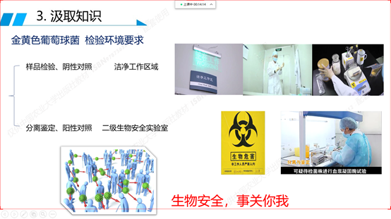 新冠肺炎疫情防控中,“生物医药与健康”专业群很多毕业生都奋战在一线,为疫情防控贡献着自己的专业力量,而且目前核酸采样、检测和疫苗开发等岗位人才需求较大。教师在专业课程教学中引入行业需求信息和优秀毕业生案例,适时融入疫情防控知识,让学生切实意识到自己所学专业的重要性,能够增加学生专业粘合度,增强专业未来发展和就业前景的信心。同时结合疫情防控在全系范围内开展生动课程思政教育。如系部刘影老师在讲到病毒传播途径时,引入疫情防控要做到“三件套、五还要”。蒋惠男老师讲到进入实验动物房穿戴要求时,引入疫情防控中“大白”们如何穿脱防护服,避免志愿服务时感染新冠。张永霞老师《药理与毒理》课程中引入中医药在抗击新冠的作用,增强了民族自信心和抗疫必胜信念。代书玲老师在讲到金黄色葡萄球菌的传染性时适时引入生物安全教育。