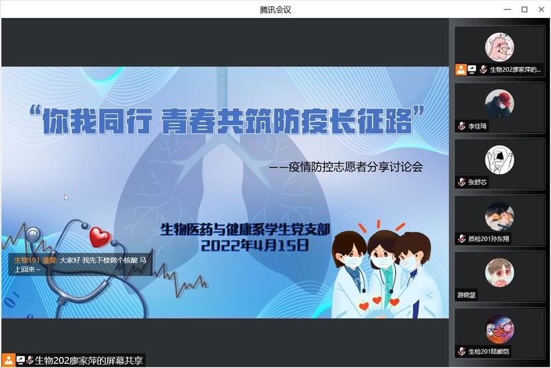 为加强大学生的社会责任意识,明确历史使命,4月15日下午,生药系学生党支部举办“你我同行,青春共筑防疫长征路”疫情防控志愿者线上分享讨论会。支部党员、入党积极分子等40余人参加。