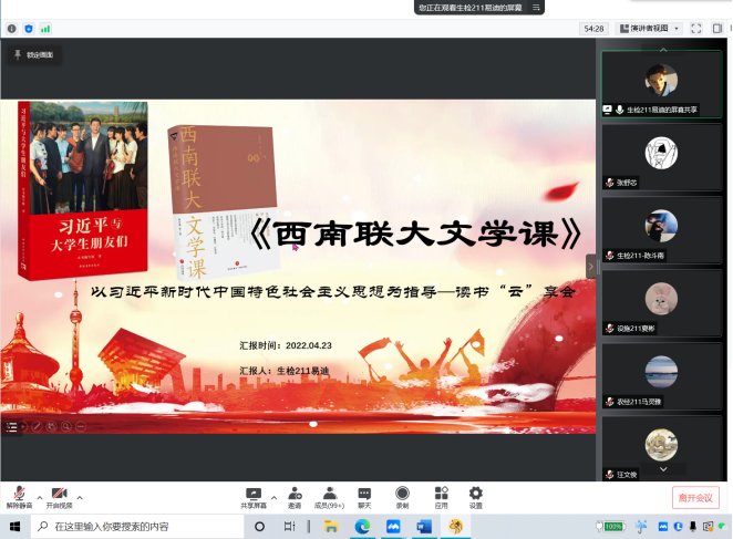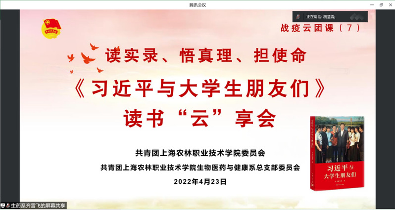 在中国共产主义青年团成立100周年之际,4月23日下午,院团委联合生药系团总支举办《习近平与大学生朋友们》读书“云”享会,院团委、生药系团总支、各系入团积极分子、团员青年代表等200余名学生在线参与,读实录、悟真理、担使命,交流心得体会。