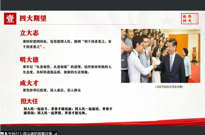 6个读书小组依次分享读书感想。质检高本贯211班杨家辉表示:通过习近平总书记在同济大学的讲话,我明白了大学生要将自己个人的理想追求与祖国未来的需要和人民群众的殷切期盼紧紧联系在一起,树立远大志向,多学习,多在实践中磨练,要像一棵树一样,向下扎根,向上生长。生检211班易迪阐述了自己对“同舟共济,自强不息”精神的理解,随后回顾了百年前的青年学生在战火纷飞中与祖国同呼吸共命运的英勇故事,生动剖析了“同舟共济”在不同历史时期的深刻含义。生检211班陈斗南表示:《习近平与大学生朋友们》系列采访实录“年轻人要自找苦吃”“要给书本上的知识‘挤挤水’”等金句让自己很受启迪,作为一名上农青年,我必当自觉肩负起巩固脱贫攻坚成果的时代责任,在实践中学习,学习中实践,毕业后到祖国最需要的地方去,助力全面推进乡村振兴。
