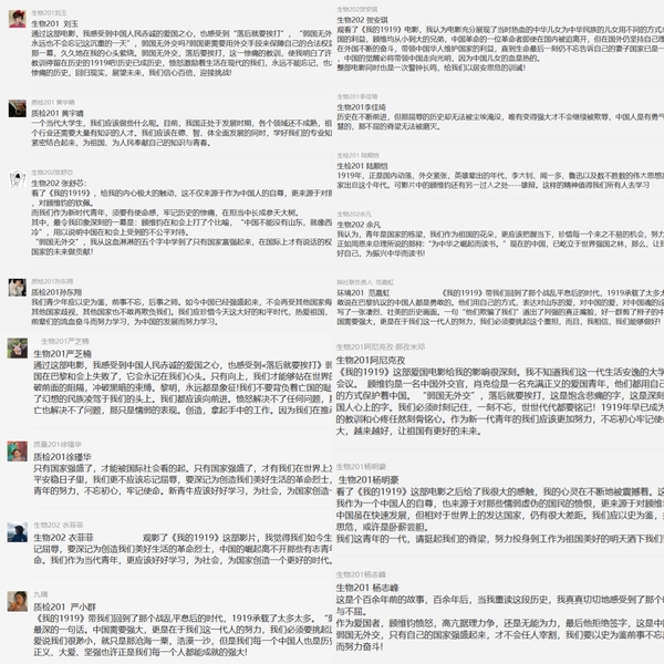 影片讲述的是第一次世界大战末,属于战胜国的中国,在巴黎和会上只得到两个席位,并在多次谈判中饱受欺辱,直至最后拒绝签定凡尔赛合约的事。影片给了同学们深深的触动,尤其感受到“弱国无外交”的硬道理,也感受到了革命烈士对国家无私的大爱。生物202班张舒芯说:“影片给我内心极大的触动。‘弱国无外交’这血淋淋的五个字让我学到了只有国家富强起来,在国际上才有说话的权利。作为新时代青年,我会牢记历史的惨痛,在担当中长成参天大树,为国家的未来做贡献!”环境201班范嘉虹说:“《我的1919》带我们回到了那个战乱平息后的时代,1919承载了太多太多。在巴黎抗议的中国人都是勇敢的,他们用自己的方式,表达对山东的爱,对中国的爱。中国需要强大,更在于我们这一代人的努力,我们必须要挑起这个重担,而且,我相信,我们能够做好!”质检贯181班许怡然说:“青年是国家的栋梁,我们更应该把握当下,珍惜每一个来之不易的机会,努力学习,为祖国、为人民奉献知识与青春。”