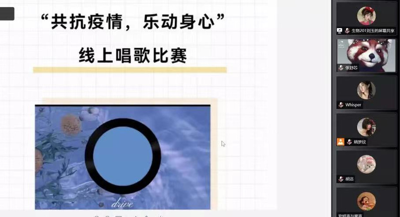 “共抗疫情,乐动身心” 线上歌会活动中同学们以曲作戟,以乐为援,以艺战疫。《暖暖》、《从前说》、《房间》、《我只在乎你》......同学们用歌声相聚云端,凝聚抗疫力量,为打赢疫情防控攻坚战,传递温暖、注入强大精神动力。