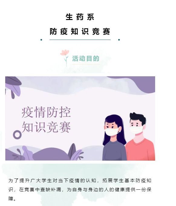 疫情防控知识竞赛由生药系生物专业学生组织发起,面向全系学生开展新冠疫情相关医药知识、防控知识、救助知识方面的竞答,向同学们普及疫情防控知识,提高防范能力,科学有效防控疫情。