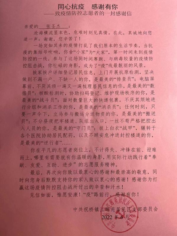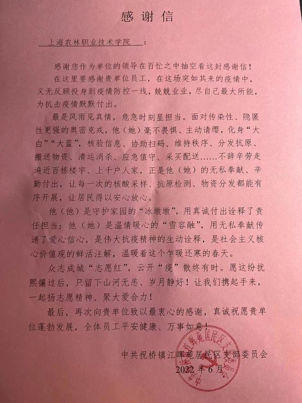 近日,学院收到祝桥镇江晖苑居委会的感谢信。信中感谢生物医药与健康系质检191班张圣杰同学对社区防疫工作所做的努力和贡献。
