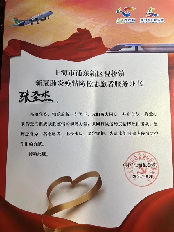 自上海疫情暴发之初,张圣杰即报名社区居委会的志愿服务工作。两个月来,他不辞辛劳做抗原检测的“排查员”、梳理信息的“数据员”、核酸检测的“战斗员”、快递物资的“消杀员”、“搬运员”等,不论风雨,不惧风险,始终冲在疫情防控的第一线,为社区居民排忧解难,体现了新时代青年的优良品质和责任担当。