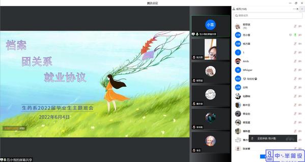 为做好2022届毕业生教育、管理和服务工作,确保毕业生离校前工作有序推进,倡导毕业生文明有序离校,生药系于6月4日下午组织召开了2022届毕业生文明离校主题班会。班会由毕业班辅导员范小雪主持召开,全体毕业生参加。