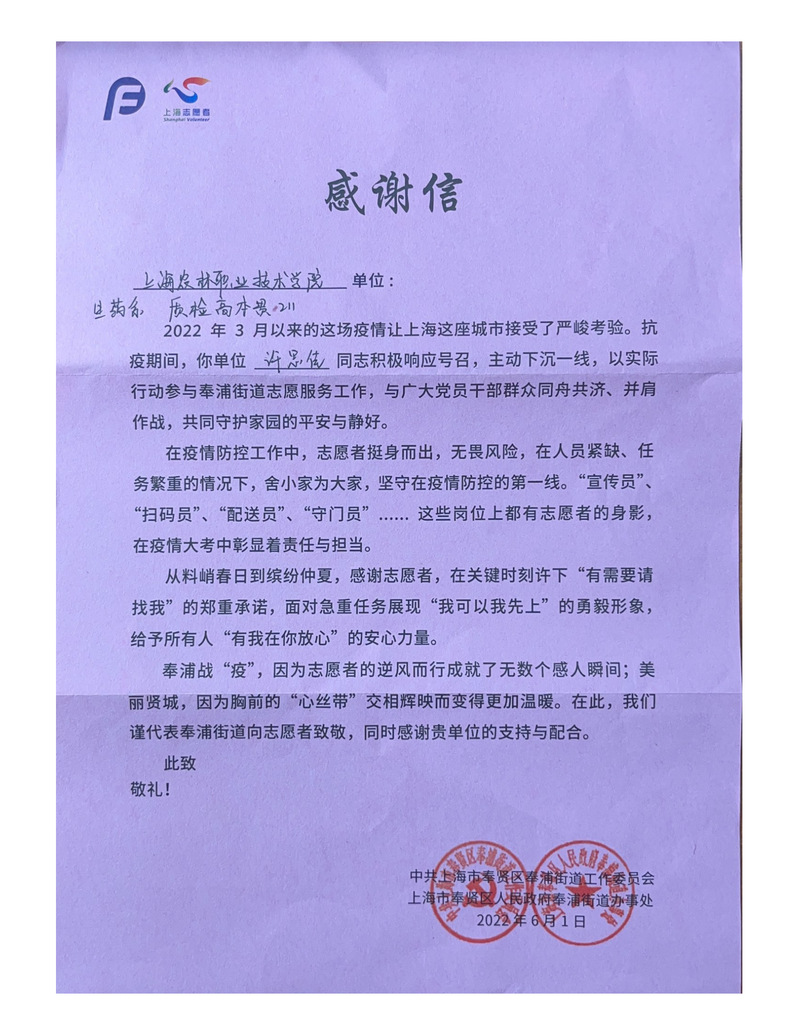 近日,学院收到奉贤区奉浦街道工作委员会的感谢信。信中感谢生物医药与健康系质检高本贯211班许思佳同学对社区防疫工作所做的努力和贡献。