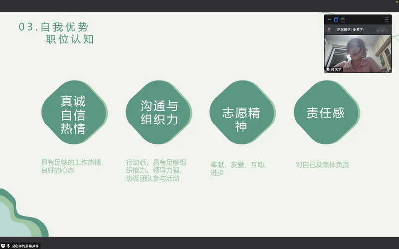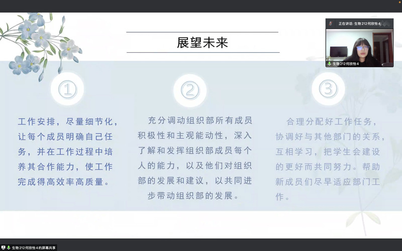 竞聘环节分为自我介绍、工作述职及现场提问等环节。根据会议安排,竞聘人员按照名单顺序依次进入腾讯会议面试,分别阐述了自身竞聘的优势、工作业绩以及对申请岗位的工作设想。在现场提问环节中,齐雪飞老师与主席团成员结合部门岗位工作,对竞聘人员工作、沟通交流能力等进行了考察提问。会议上,同学们逐一展示自己的综合实力与胜任竞聘岗位的信心。
