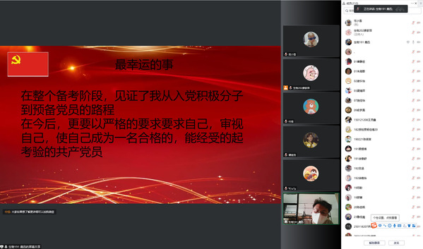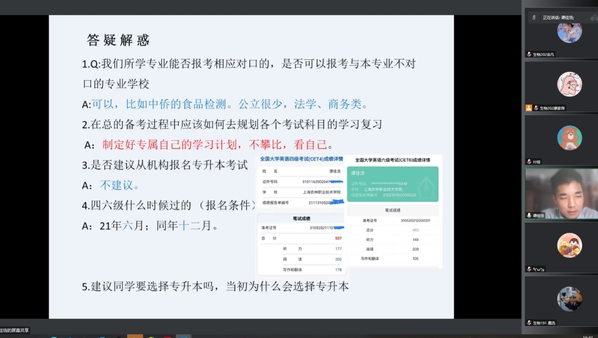 生物191班付佳和鹿迅,是毕业生党员代表,今年均以第一名的成绩分别考入上海应用技术大学化学工程与工艺专业和上海中侨职业技术大学食品质量与安全专业。他们都谈到,入党积极分子阶段的培养教育直至最后发展为预备党员,一直是对自己最大的激励和肯定,思想上的启迪让学习的步伐更加坚定。付佳说,成为入党积极分子后,她才完成了从迷茫到有计划有目标自我提升的转变。鹿迅说:备考阶段,见证了他从入党积极分子到预备党员的路程。今后,要以更严格的要求审视自己,使自己成为一名合格的、能经受的起考验的共产党员。质检贯191班谭佳浩,从421名考生中脱颖而出,成为三十八分之一,考入上海政法学院。三位同学从当前的学习生活、备考过程、时间管理等方面分享了专升本及四六级方面的经验,并回应同学困惑。