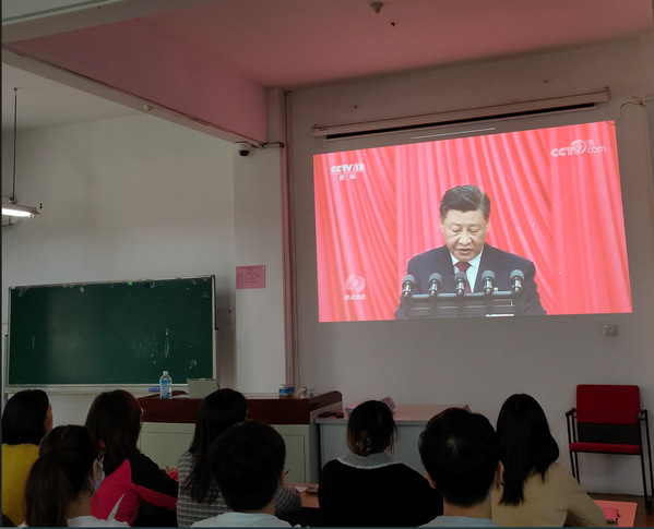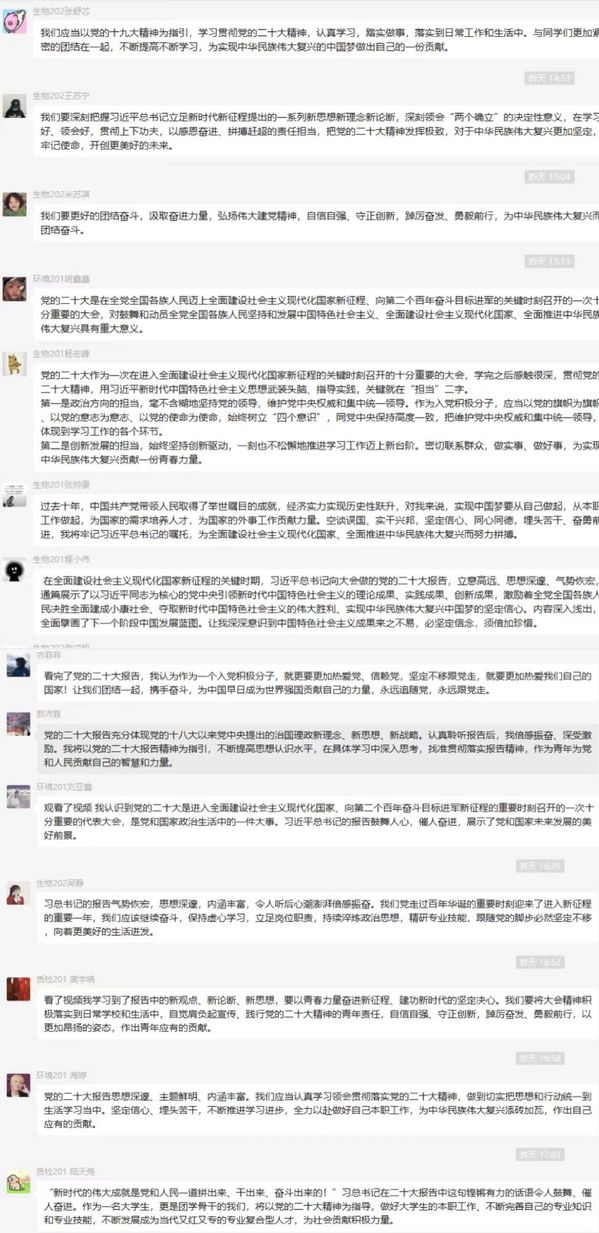 总支书记蒋洁说:“党的二十大胜利召开,深受鼓舞,倍感振奋。我们要坚定理想信念,坚持立德树人,坚守思想政治教育阵地,为党育人,为国育才。”辅导员范小雪说:“要以习近平新时代中国特色社会主义思想为指导,深入学习并全面贯彻党的二十大精神,用实际行动做好青年学生的领路人!”质检贯182苏奕宇说:“作为入党积极分子要主动学习党的二十大精神,担负起时代赋予青年的重任,以奋斗擦亮最亮丽的青春底色。”环境202缪穗说:“作为一名大学生,对党和国家取得的巨大成就倍感自豪,对二十大今后五年的宏伟蓝图充满期待,也对美好未来充满信心,我要努力为实现中华民族伟大复兴中国梦而贡献力量!。”