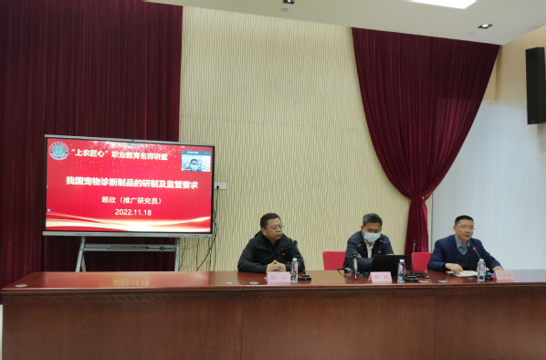 11月18日下午,在综合楼206会议室举行“上农匠心”职业教育名师讲堂系列专题报告会,报告由学院“药物研发与创新大师工作室”首席大师、上海市动物疫病预防控制中心研究员顾欣主讲,报告主题为“我国宠物诊断制品的研制及监管要求”。本期活动由科研处主办、生药系承办,以线上线下同步直播的形式进行。学院副院长张江、科研处及生药系部分师生共70余人参加。报告会由生药系李何君老师主持。