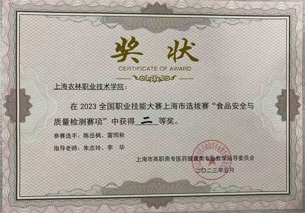 5月19日,全国职业技能大赛食品安全与质量检测竞赛上海选拔赛在上海城建职业学院举办。比赛分为“亚硝酸盐的测定”和“菌落总数的测定”两个模块。我校环境211班雷雨秋和陈岳枫代表学校参加此次竞赛,荣获二等奖,入围国赛。由生药系副主任徐莉带队,生药系教师李华和朱志玲为指导老师。