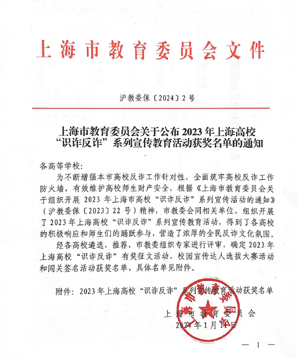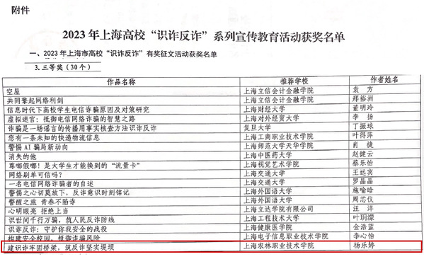 近日,根据上海市教育委员会《2023 年上海高校“识诈反诈”系列宣传教育活动获奖名单》沪教委保〔2024]2号,生物医药与健康系环境221班杨乐婷《建识诈牢固桥梁,筑反诈坚实堤坝》获2023 年上海市高校“识诈反诈”有奖征文活动三等奖。